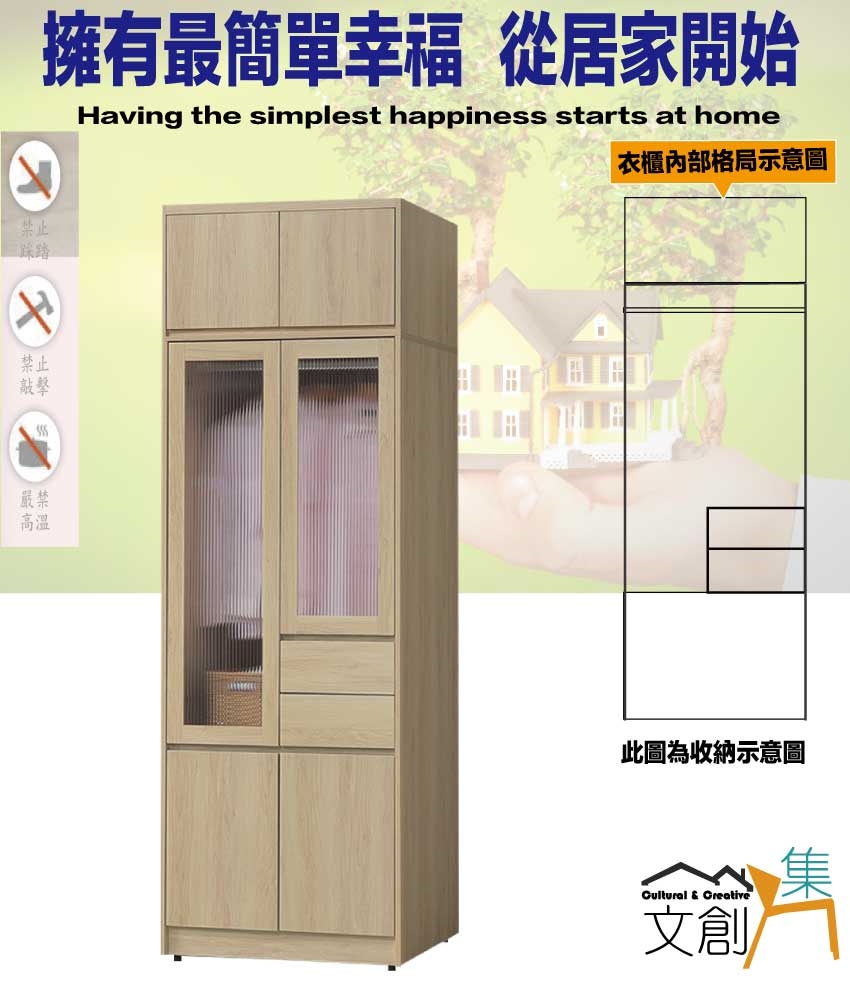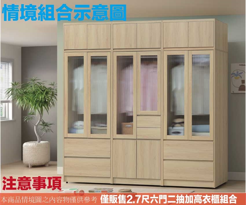 ◆產品名稱:【綠家居】愛楓原橡2.7尺六門二抽加高衣櫃組合