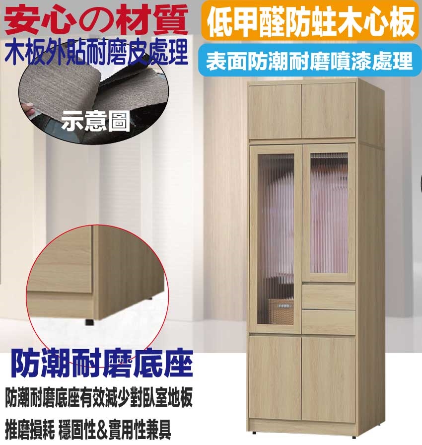 【綠家居】愛楓原橡2.7尺六門二抽加高衣櫃組合     原橡木紋色系+現代簡約風格+安心材質製造,使用放心+搭配居家更便利,整體採用防蛀木心板+防潮耐磨底座(可調高低水平)+防夾手緩衝門片五金+PC壓克力門片等安心材質製造搭配外層採用防潮耐磨噴漆處理 ,採用開門櫃+吊衣桿+抽屜+內開放層格等收納空間設計,全由專人配送到家,專業安心服務,替你省下更多時間!