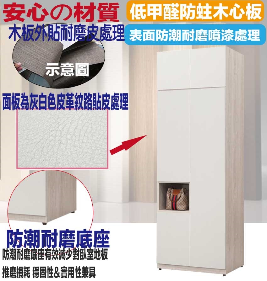 材質:防蛀木心板+防潮耐磨底座(可調高低水平)+防夾手緩衝門片五金+面板為灰白色皮革紋路貼皮處理