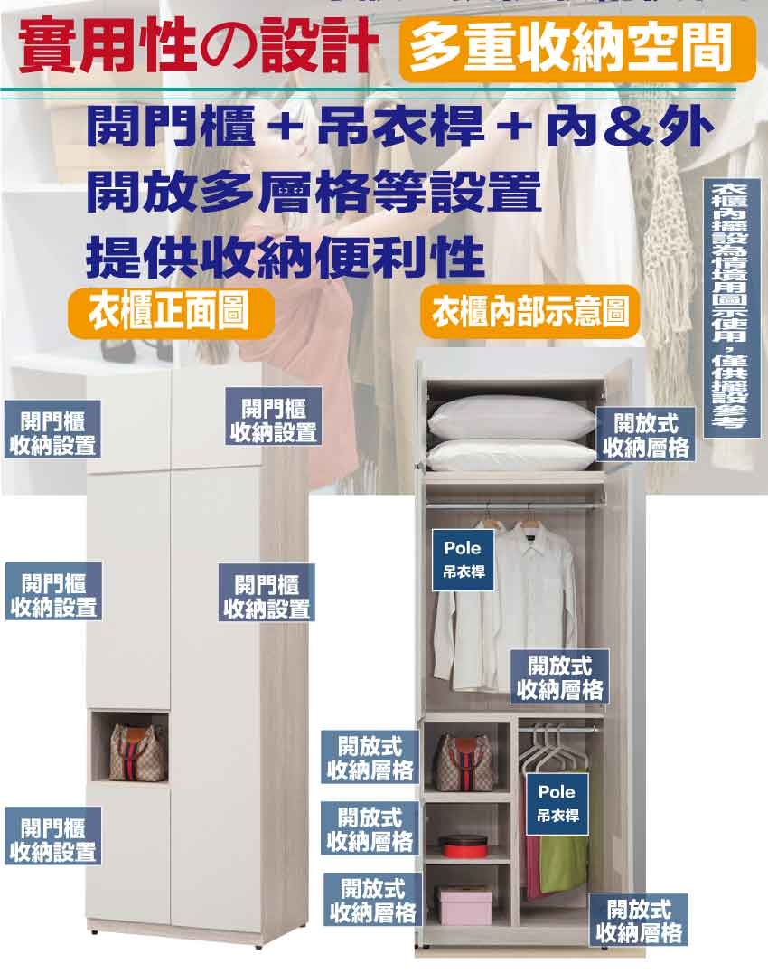 採用開門櫃+吊衣桿+內&外開放層格等收納空間設計