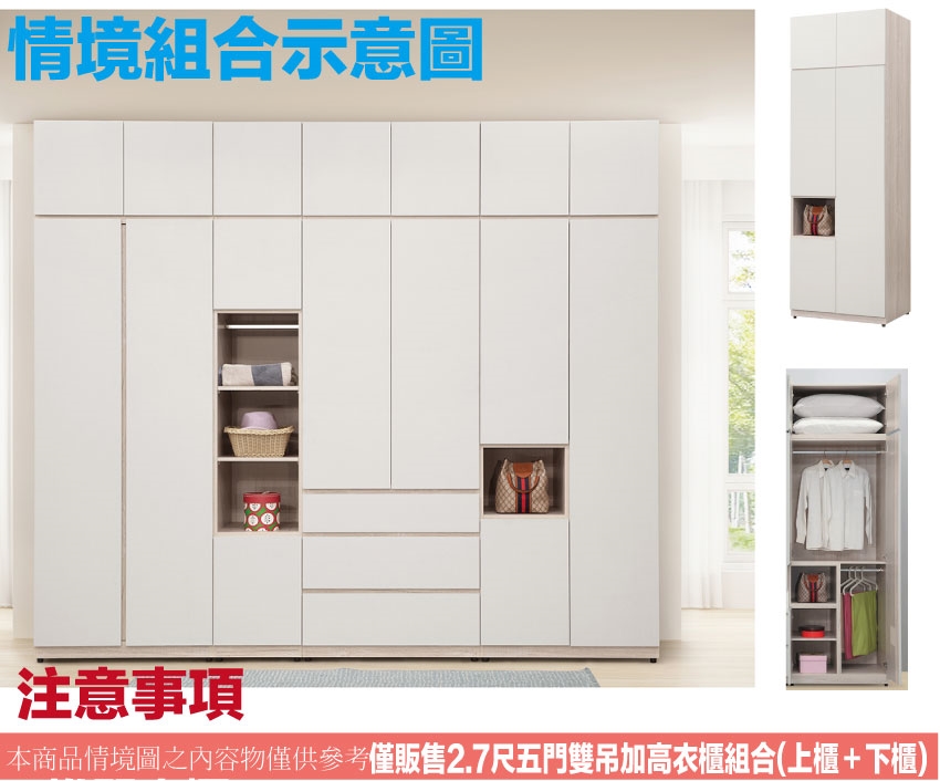 【綠家居】秋季2.7尺五門中空雙吊加高衣櫃組合