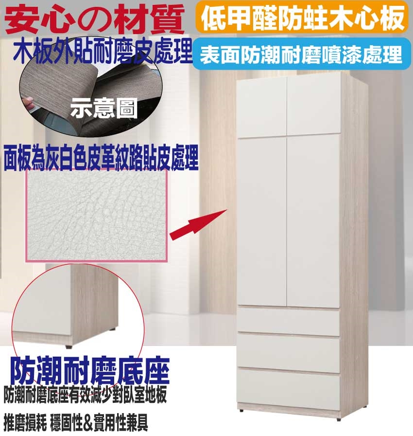 【綠家居】秋季2.7尺四門三抽加高衣櫃組合 木紋雙色系+現代簡約風格+安心材質製造,使用放心+搭配居家更便利,整體採用防蛀木心板+防潮耐磨底座(可調高低水平)+防夾手緩衝門片五金+面板為灰白色皮革紋路貼皮處理等安心材質製造搭配外層採用防潮耐磨噴漆處理 ,採用開門櫃+吊衣桿+三抽屜+內開放層格等收納空間設計,全由專人配送到家,專業安心服務,替你省下更多時間!