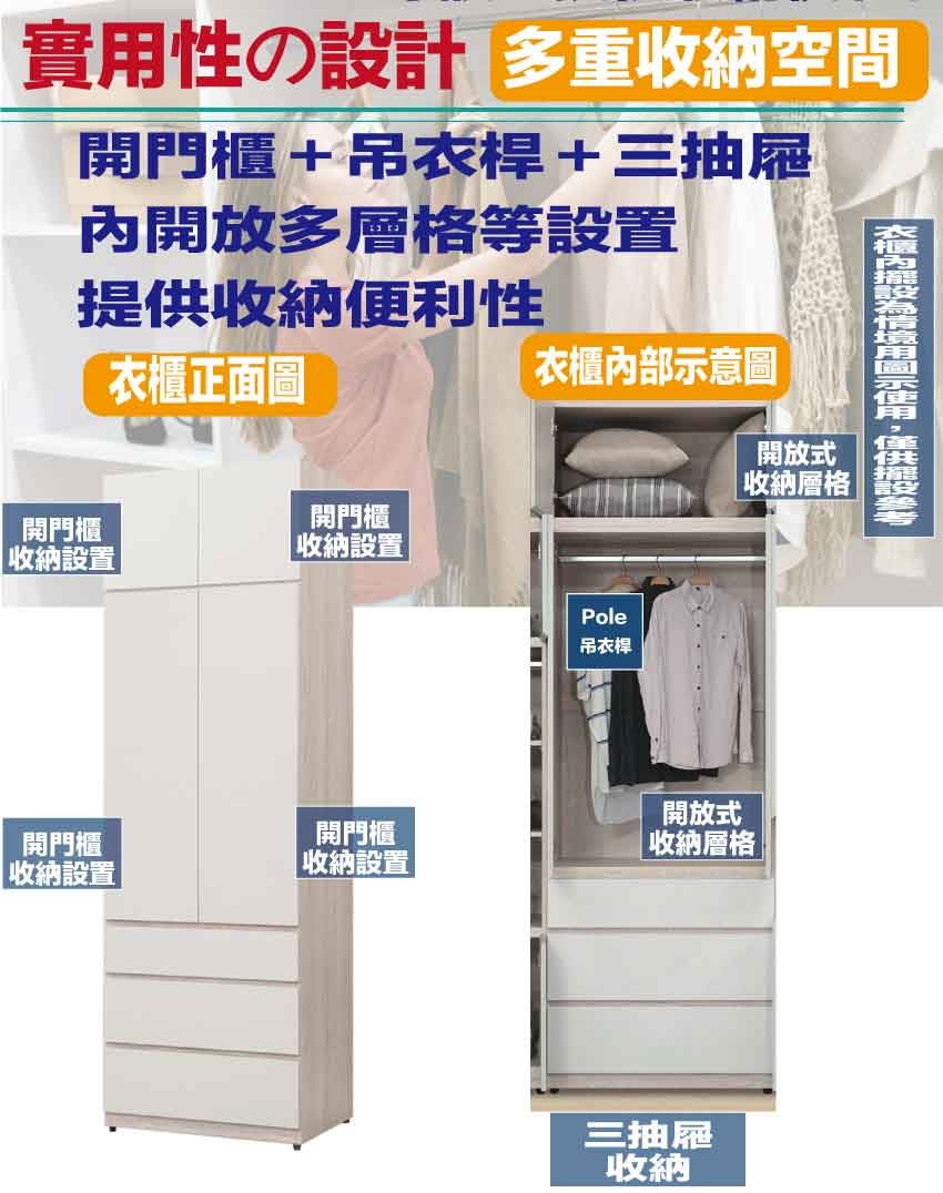 採用開門櫃+吊衣桿+三抽屜+內開放層格等收納空間設計