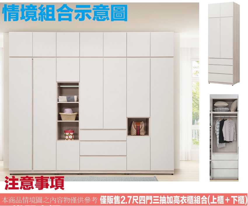 【綠家居】秋季2.7尺四門三抽加高衣櫃組合
