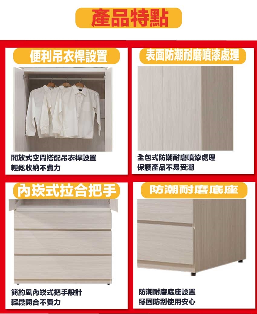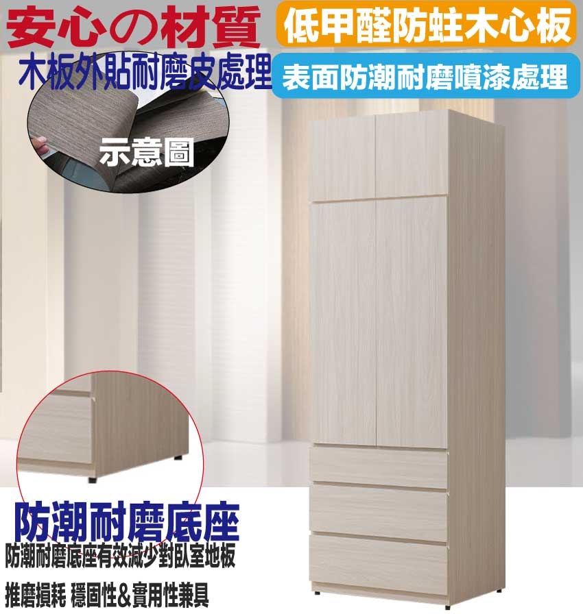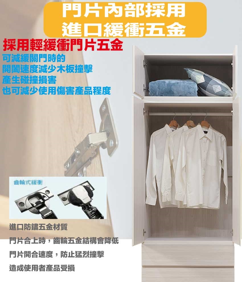 材質:防蛀木心板+防潮耐磨底座(可調高低水平)+防夾手緩衝門片五金
