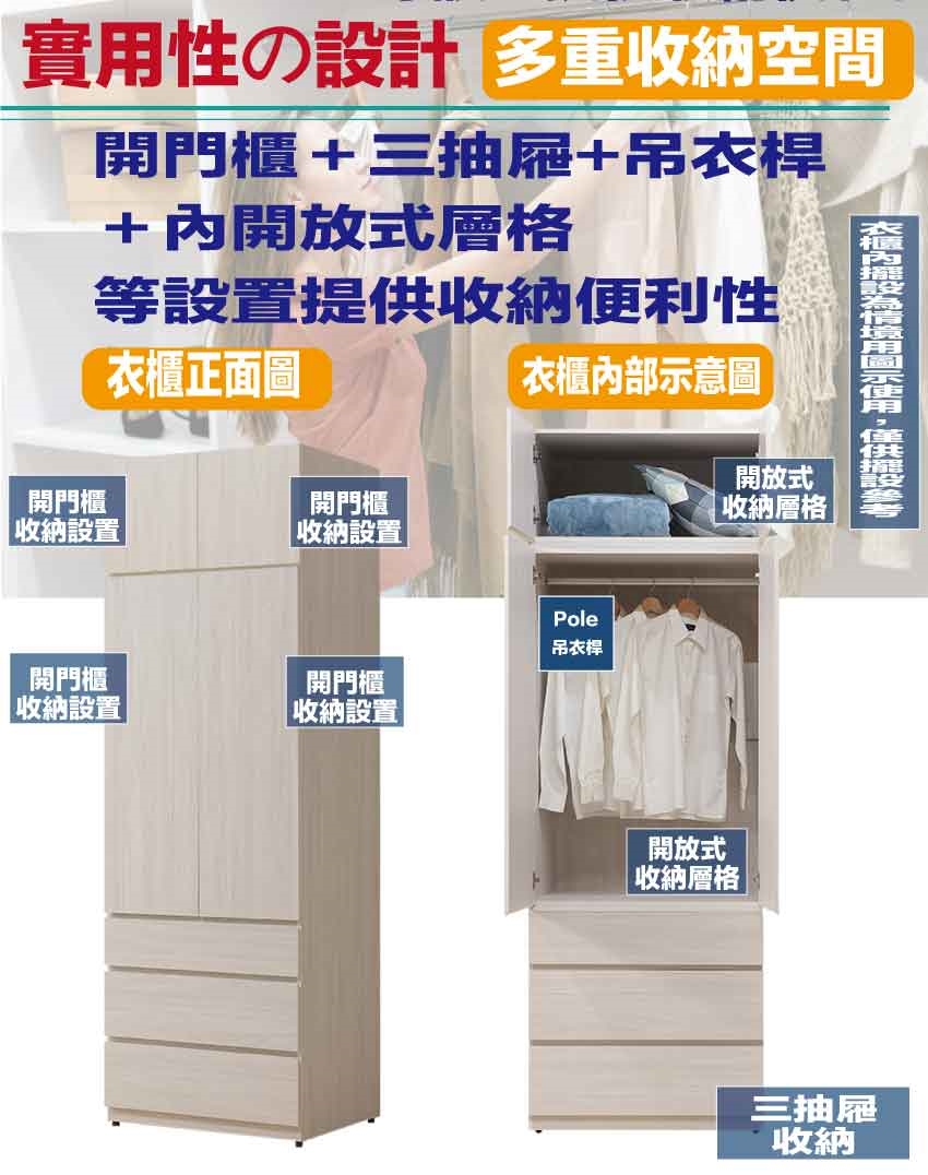 採用開門櫃+吊衣桿+三抽屜內開放層格等收納空間設計