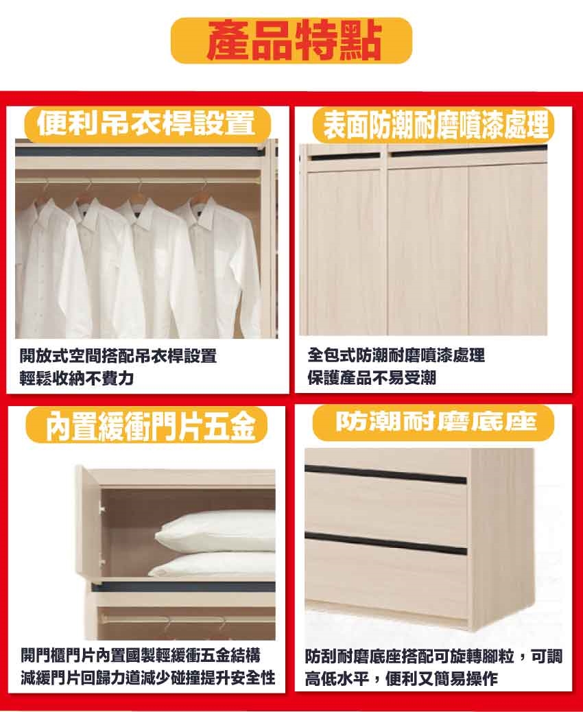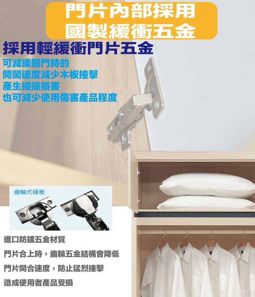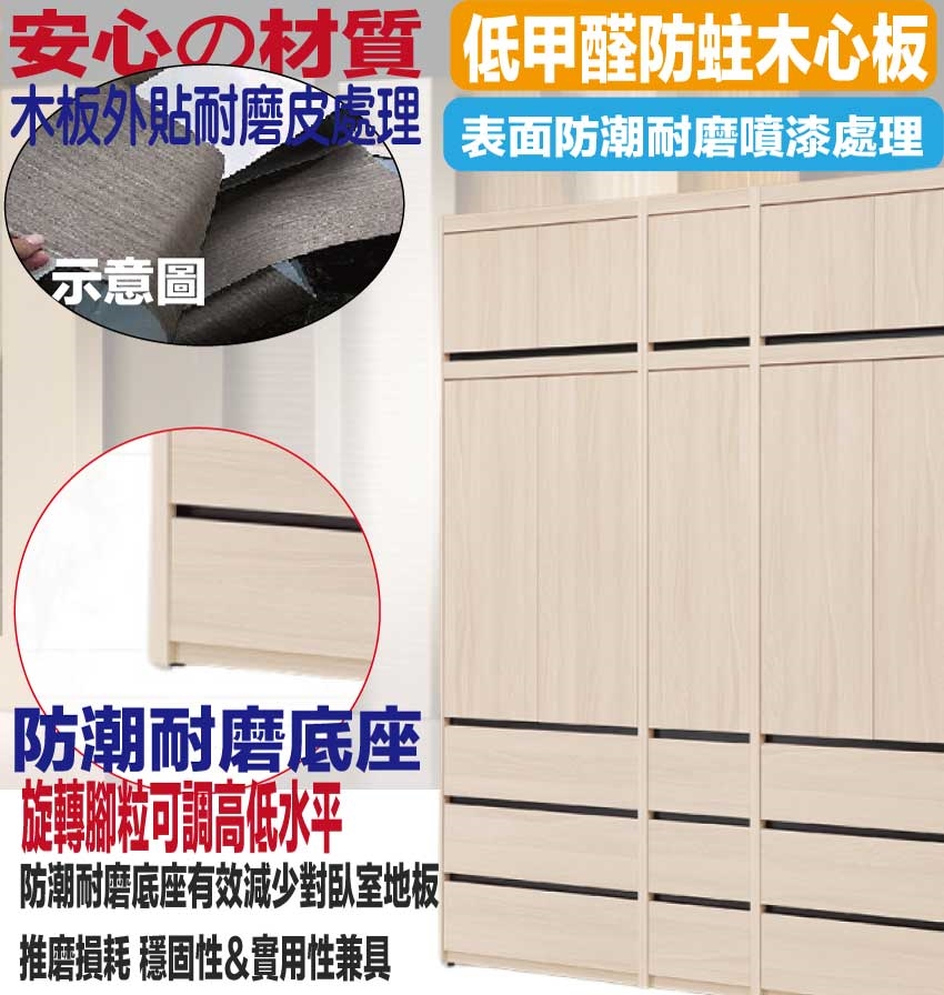 材質:防蛀木心板+防潮耐磨底座(可調高低水平)+防夾手緩衝門片五金