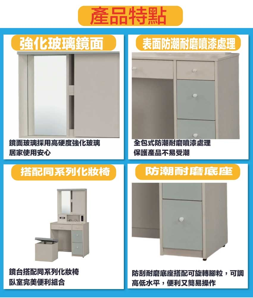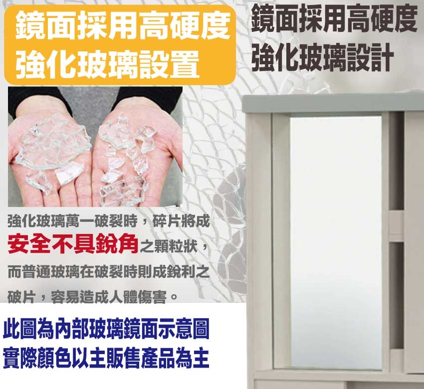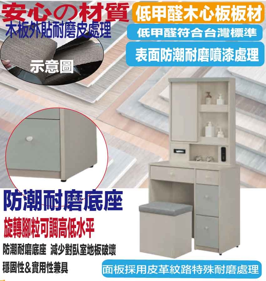 採用防蛀木心板+強化玻璃鏡面+防潮耐磨底座(可調高低水平)+面板採用皮革紋路特殊耐磨處理等安心材質製造
