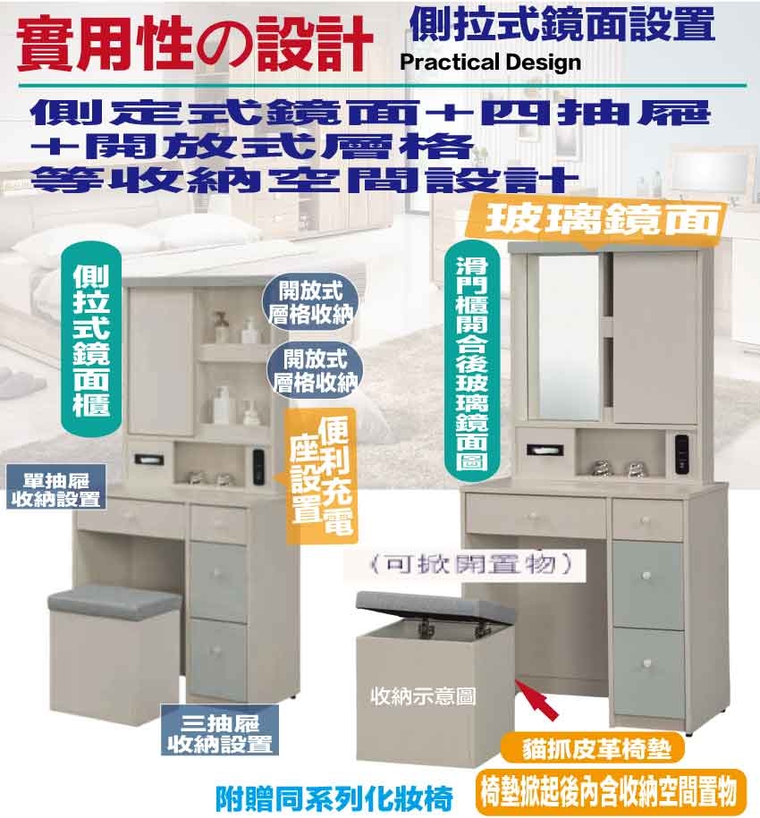 搭配採用側拉鏡面櫃+四抽屜+內&外開放層格等收納空間設計
