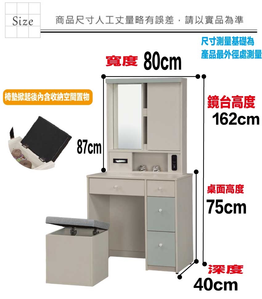 卡黛2.7尺側拉式鏡面鏡台/化妝台組合(含可收納化妝椅) 尺寸:(寬)80x(深)40x(高)162/公分 ◆材質: 材質:防蛀木心板+強化玻璃鏡面+防潮耐磨底座(可調高低水平)+面板採用皮革紋路特殊耐磨處理 - ◎注意事項: