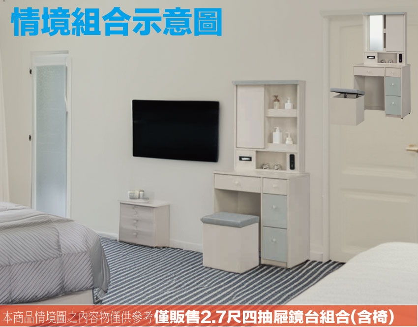 卡黛2.7尺側拉式鏡面鏡台/化妝台組合(含可收納化妝椅) 木紋雙色系+安心材質製造,使用放心+搭配居家更便利,採用防蛀木心板+強化玻璃鏡面+防潮耐磨底座(可調高低水平)+面板採用皮革紋路特殊耐磨處理等安心材質製造 ,外層採用防潮耐磨噴漆處理搭配採用側拉鏡面櫃+四抽屜+內&外開放層格等收納空間設計,全由專人配送到家,專業安心服務,替你省下更多時間!