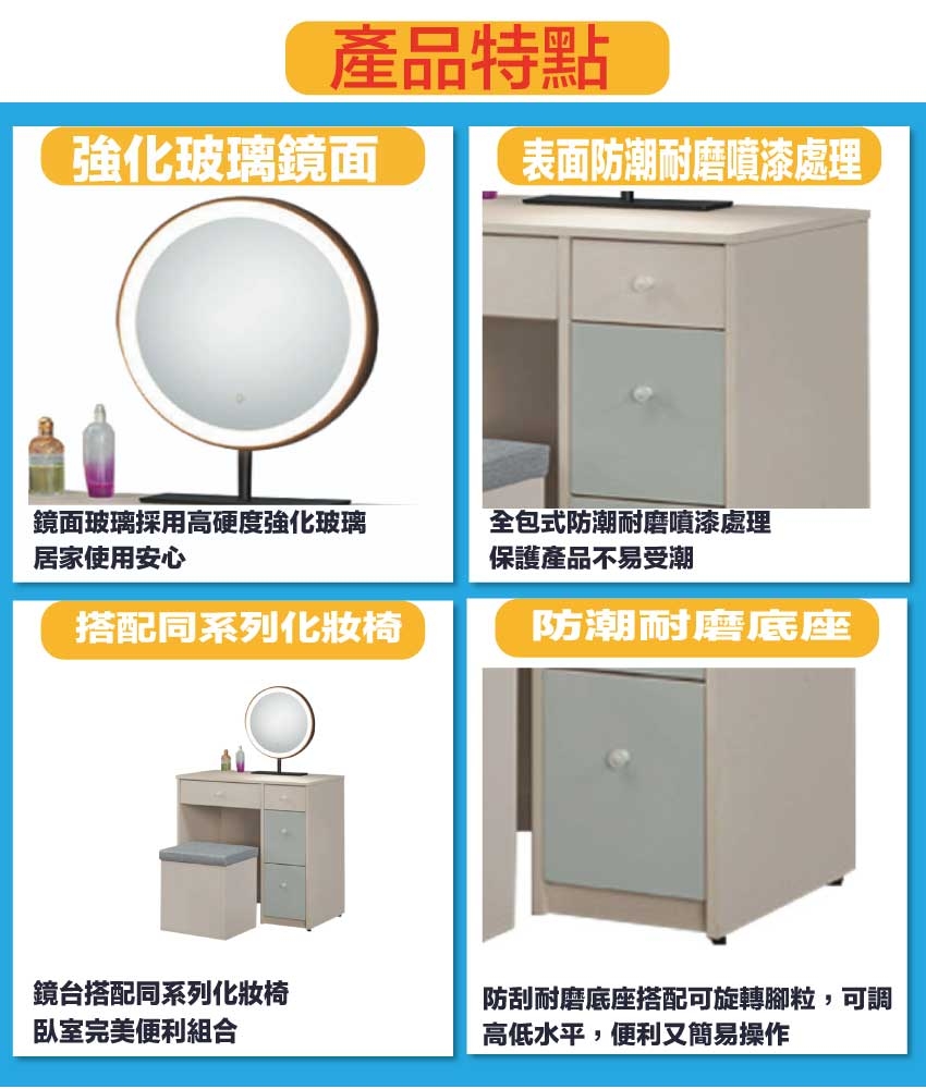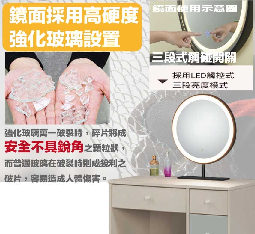採用防蛀木心板+強化玻璃鏡面+防潮耐磨底座(可調高低水平)+面板採用皮革紋路特殊耐磨處理等安心材質製造