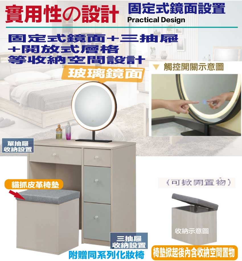 搭配採用(固定鏡面)觸控鏡面座+四抽屜+內&外開放層格等收納空間設計