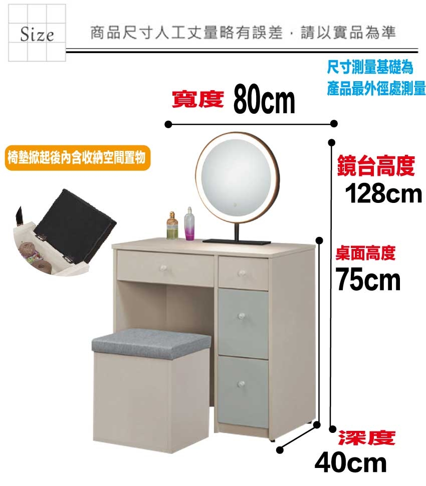 鏡台搭配可掀收納化妝椅凳,滿足您居家空間使用便利性