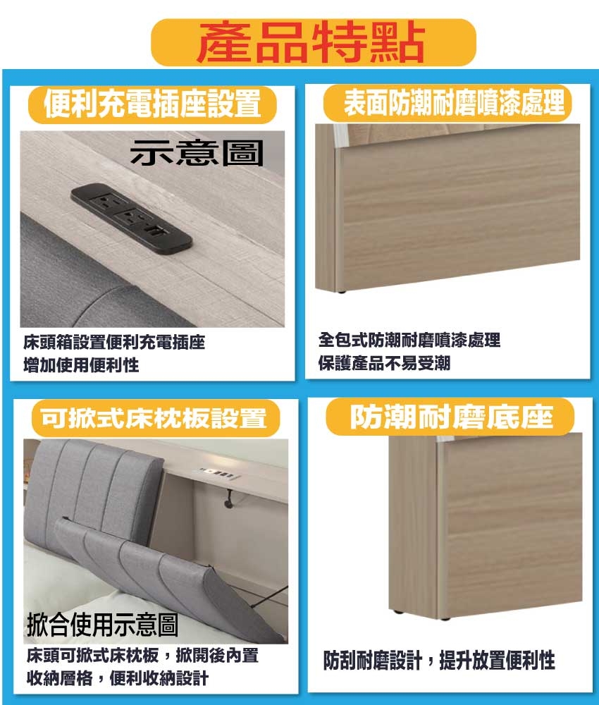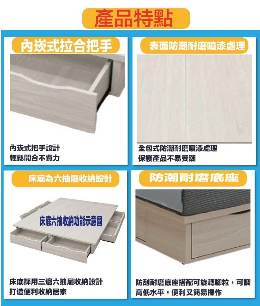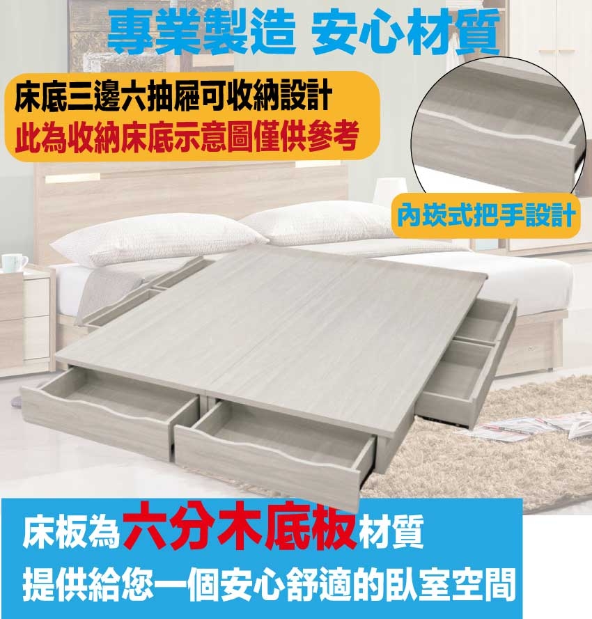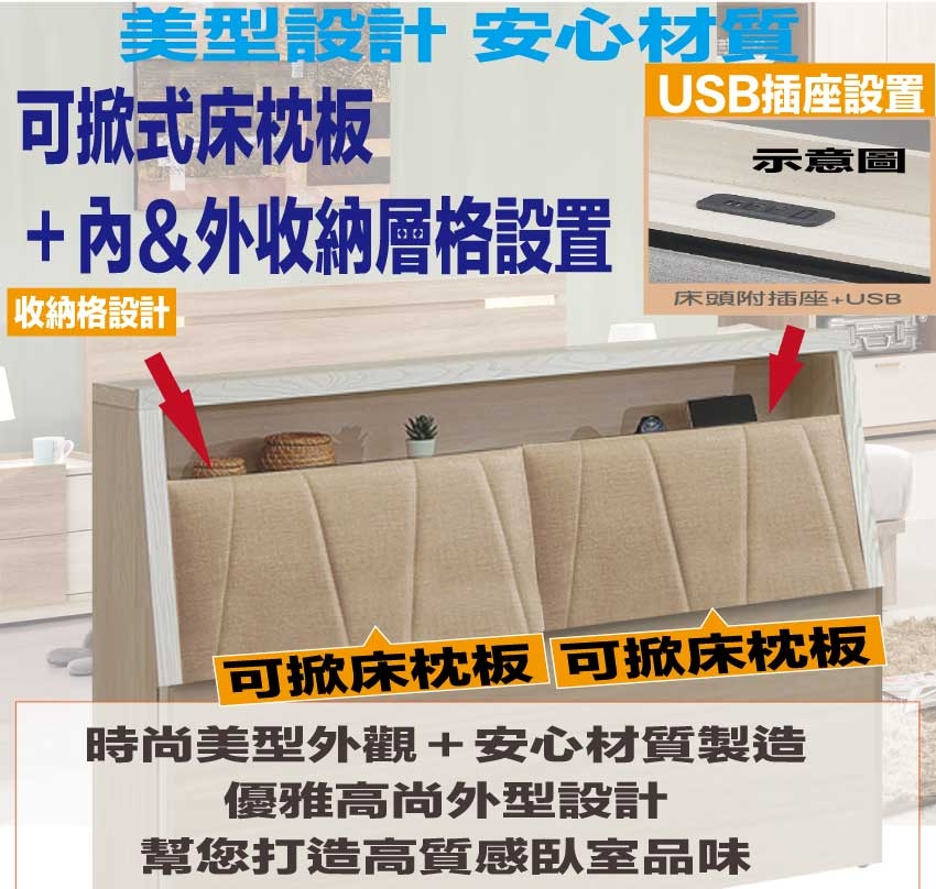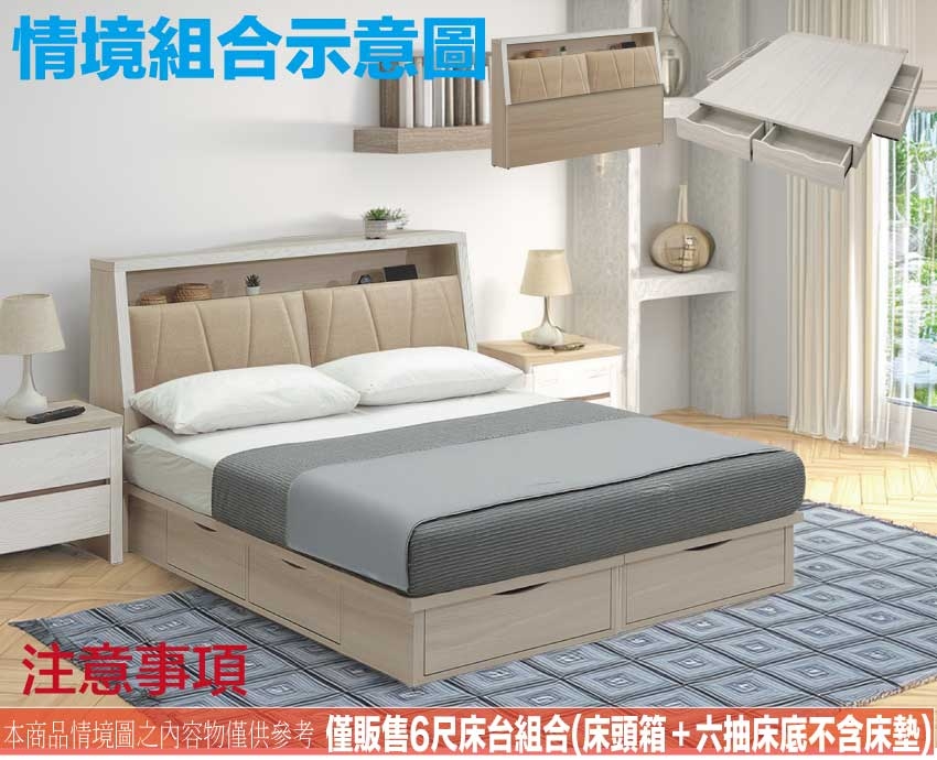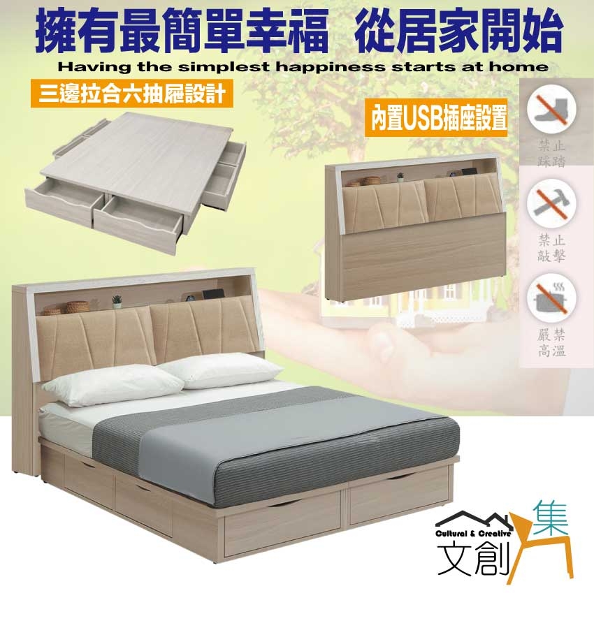 搭配採用床頭箱可掀式床枕板+內&外收納層格+內附USB插座設置+床底座三邊開合六抽屜等收納空間設計