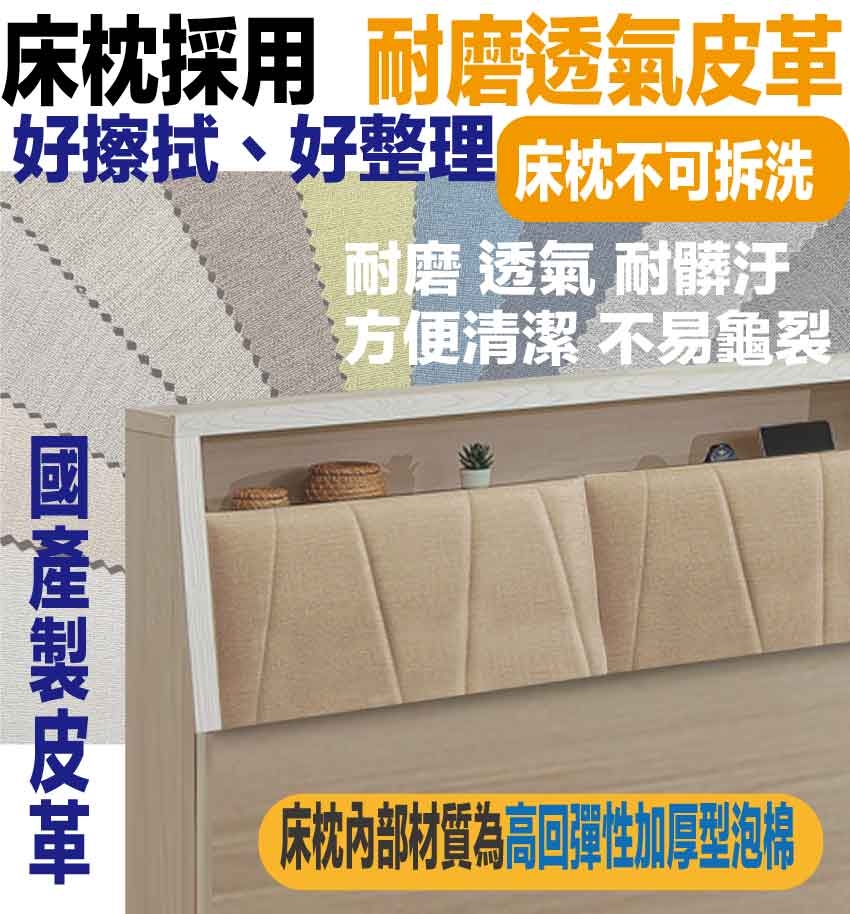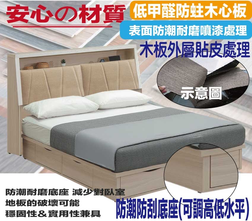 採用防蛀木心板+六分木床板+防潮耐磨底座+耐磨透氣皮革+高回彈性加厚型泡棉等安心材質製造