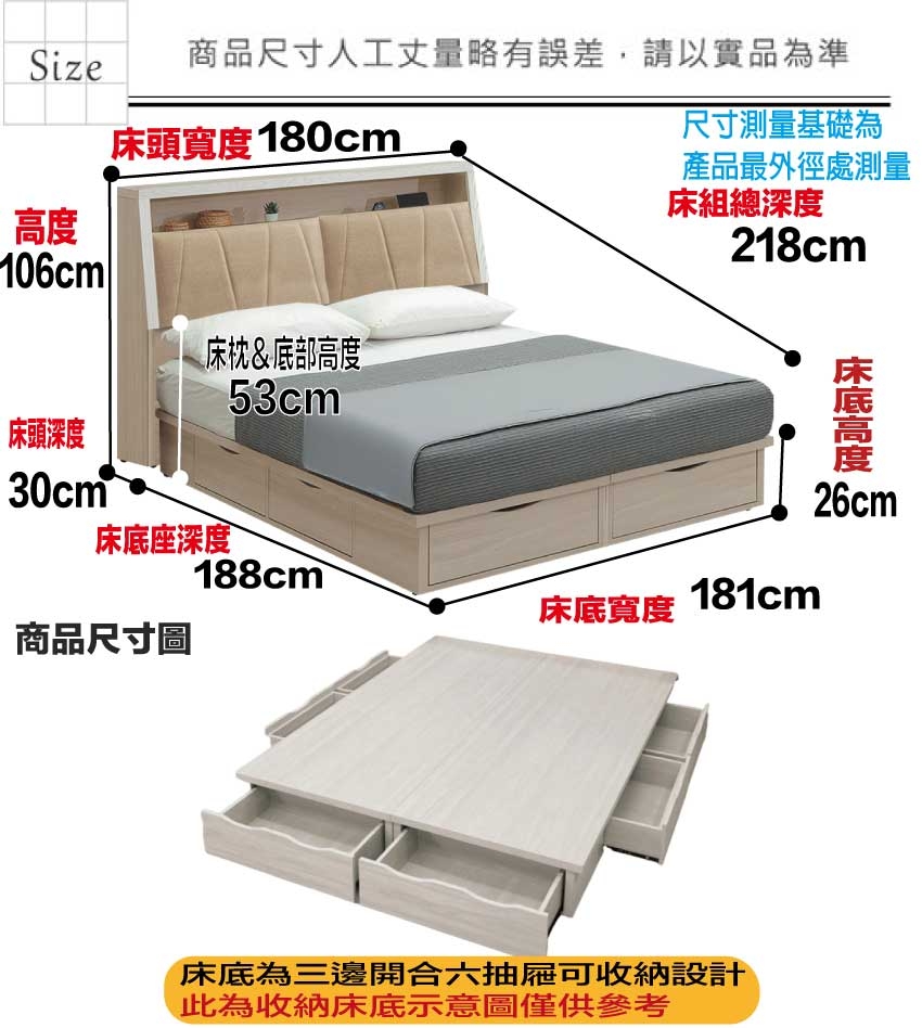盧克6尺雙人加大六抽床台組合(床頭箱+六抽床底+不含床墊) 床頭尺寸:(寬)180x(深)30x(高)106/公分 床底尺寸:(寬)181x(深)188x(高)26/公分 床台組合尺寸:(寬)181x(深)218x(高)106/公分 ◆材質: 材質:防蛀木心板+六分木床板+防潮耐磨底座+耐磨透氣皮革+高回彈性加厚型泡棉 - ◎注意事項: