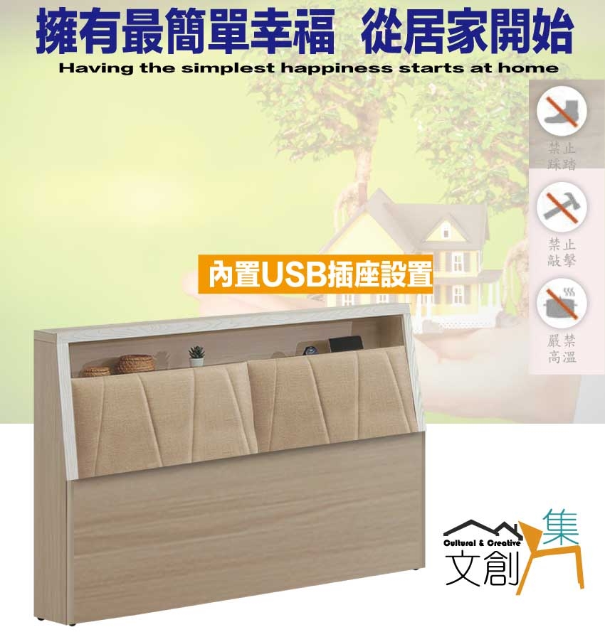 搭配採用床頭箱可掀式床枕板+內&外收納層格+內附USB插座設置等收納空間設計