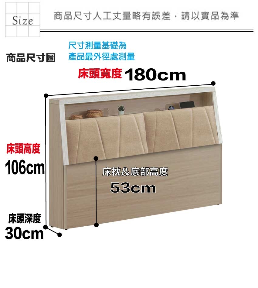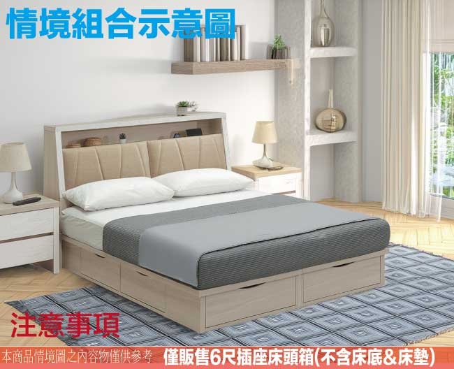 盧克6尺雙人加大皮革插座床頭箱(不含床底+不含床墊) 床頭尺寸:(寬)180x(深)30x(高)106/公分 ◆材質: 材質:防蛀木心板+防潮耐磨底座+耐磨透氣皮革+高回彈性加厚型泡棉 - ◎注意事項:
