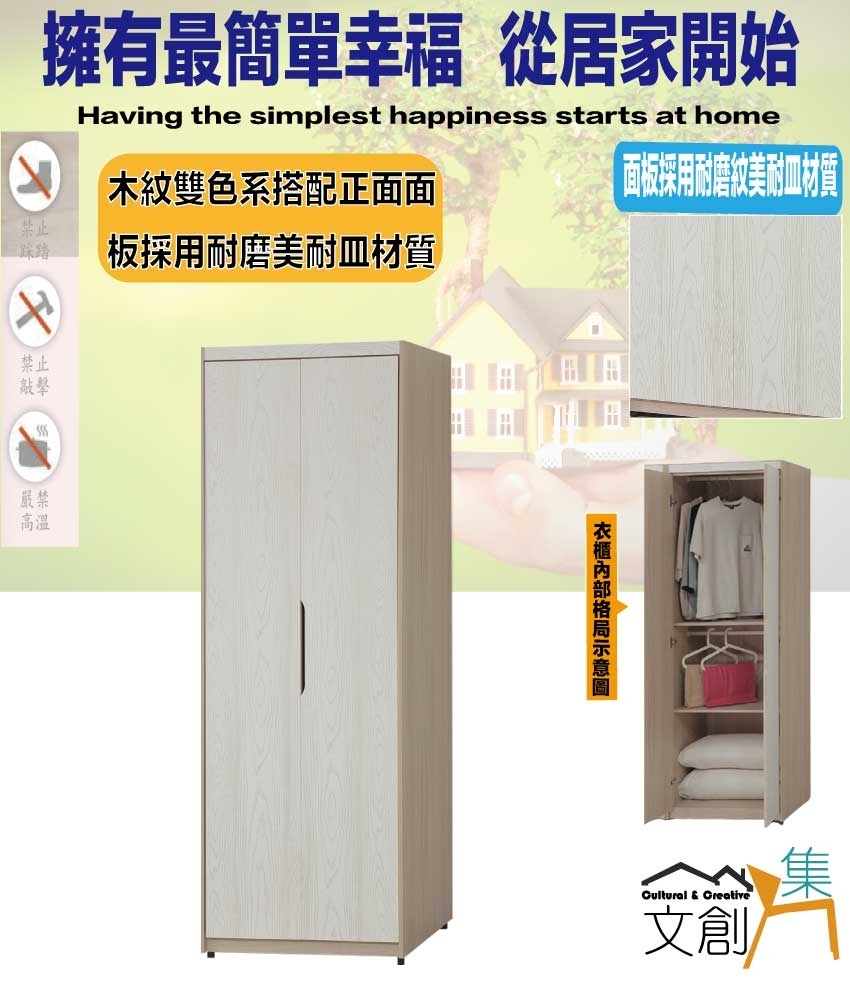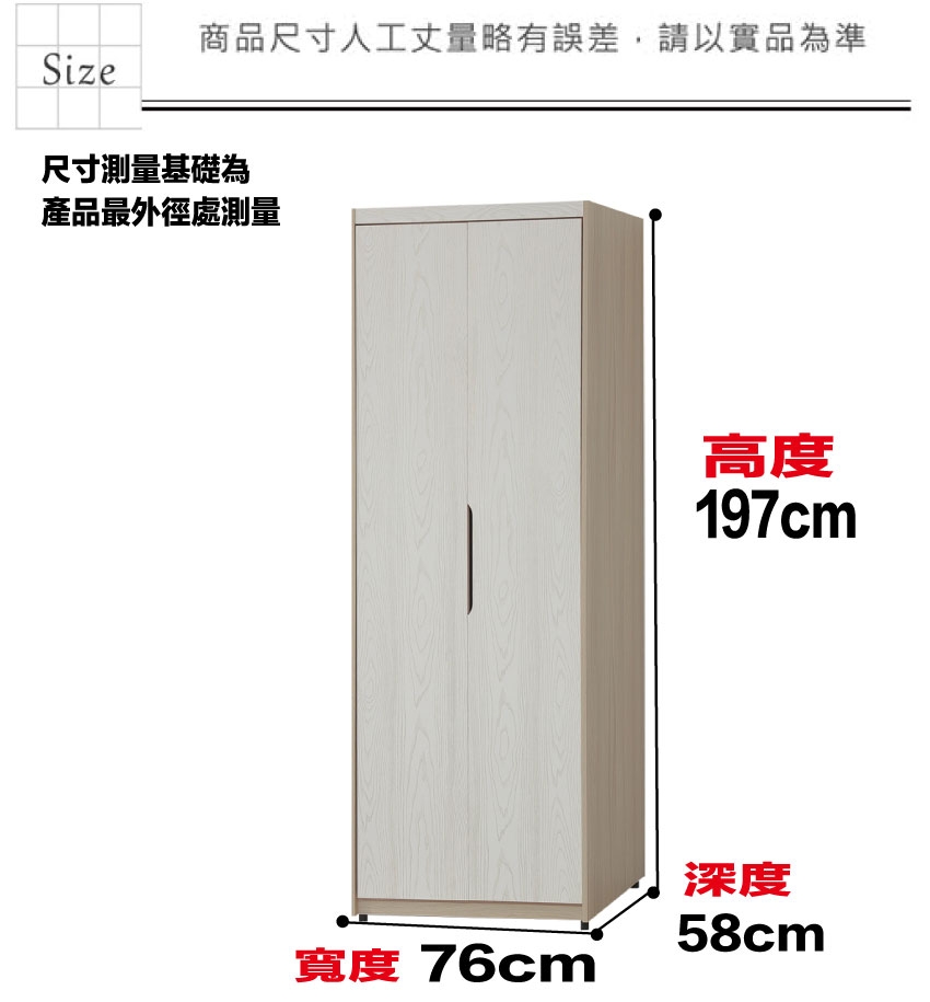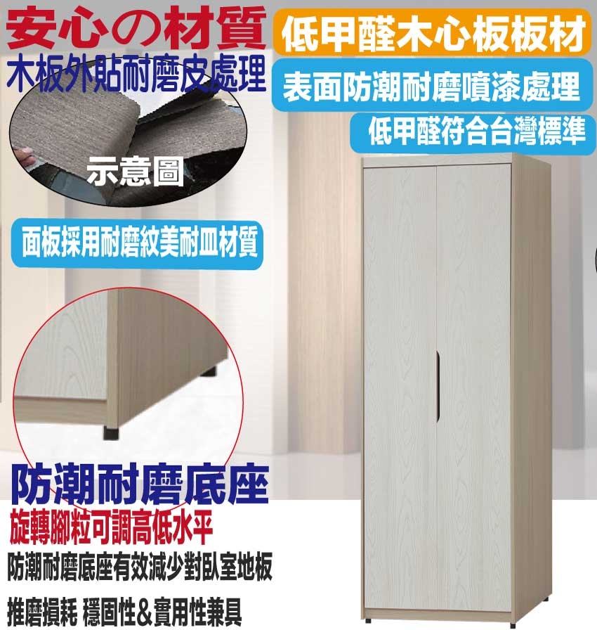 盧克2.5尺二門雙吊衣櫃 尺寸:(寬)76x(深)58x(高)197/公分 ◆材質: 材質:防蛀木心板+防潮耐磨底座(可調高低水平)+防夾手緩衝門片五金+面板採用耐磨紋美耐皿材質 - ◎注意事項: