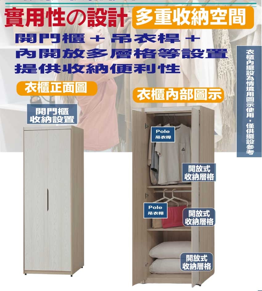- 開門櫃+吊衣桿+內開放層格