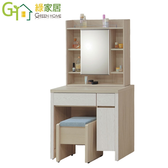 【綠家居】盧克3尺開合式鏡面鏡台/化妝台組合(含可收納化妝椅) 木紋雙色系+安心材質製造,使用放心+搭配居家更便利,採用防蛀木心板+強化玻璃鏡面+防潮耐磨底座(可調高低水平)+面板採用耐磨紋美耐皿材質等安心材質製造 ,外層採用防潮耐磨噴漆處理搭配採用開合鏡面櫃+二抽屜+開門櫃+內&外開放層格等收納空間設計,全由專人配送到家,專業安心服務,替你省下更多時間!