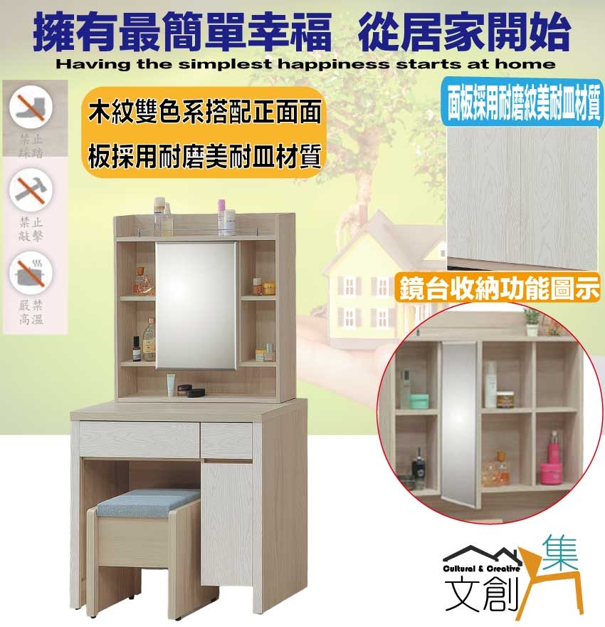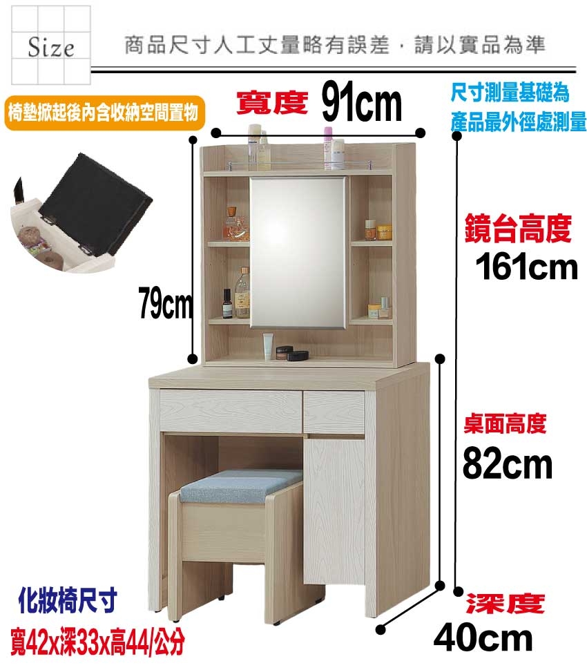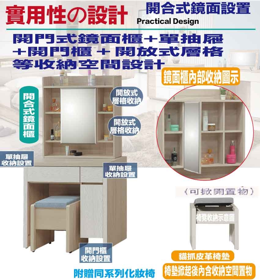 鏡台搭配可掀收納化妝椅凳,滿足您居家空間使用便利性
