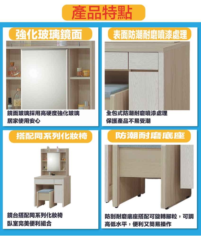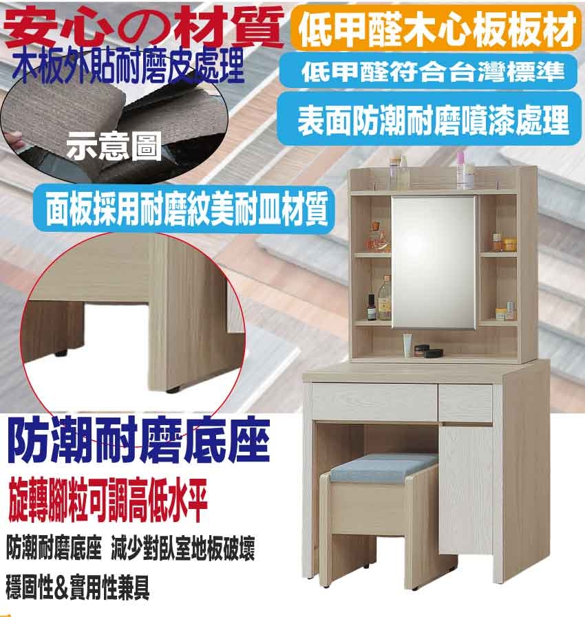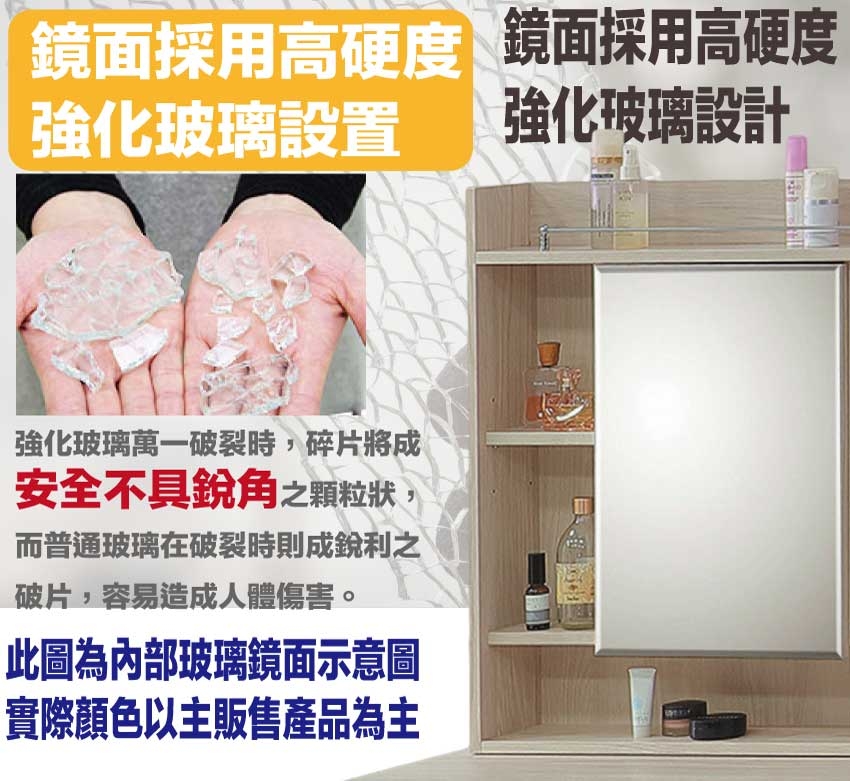 採用防蛀木心板+強化玻璃鏡面+防潮耐磨底座(可調高低水平)+面板採用耐磨紋美耐皿材質等安心材質製造
