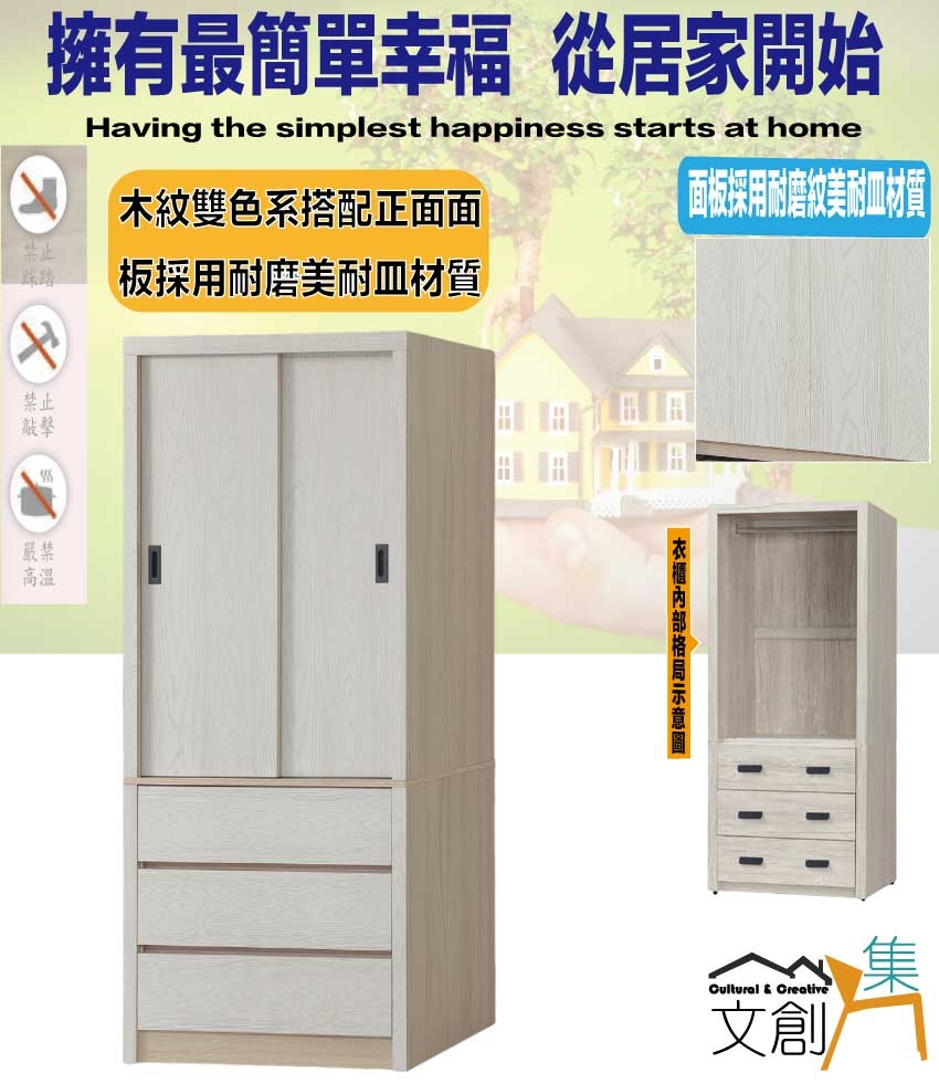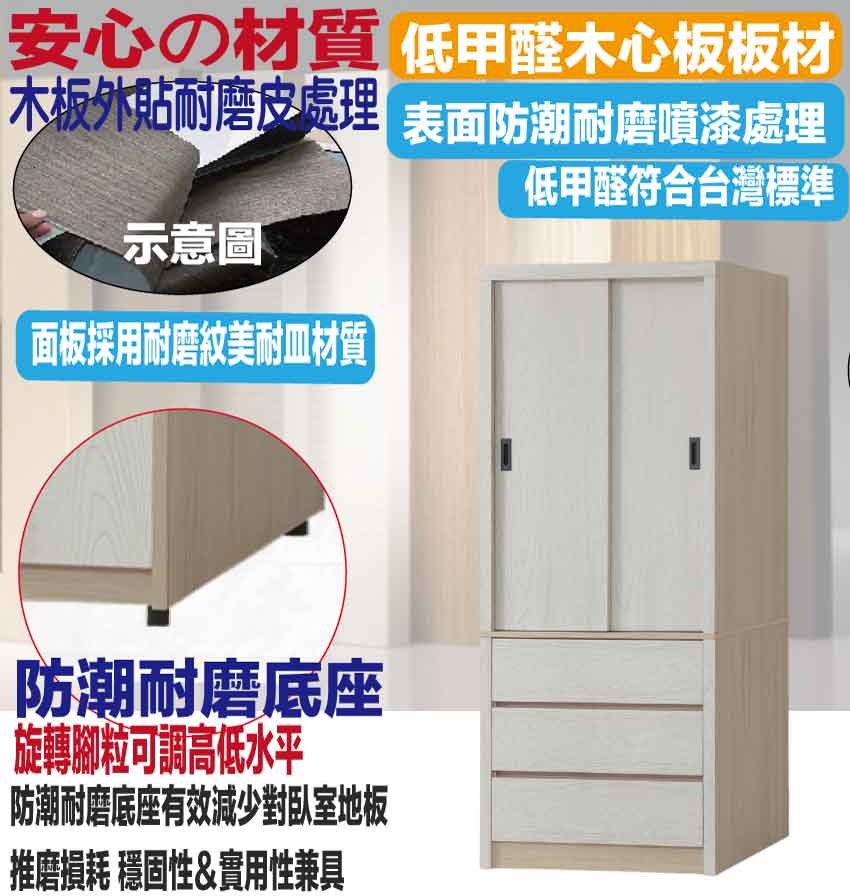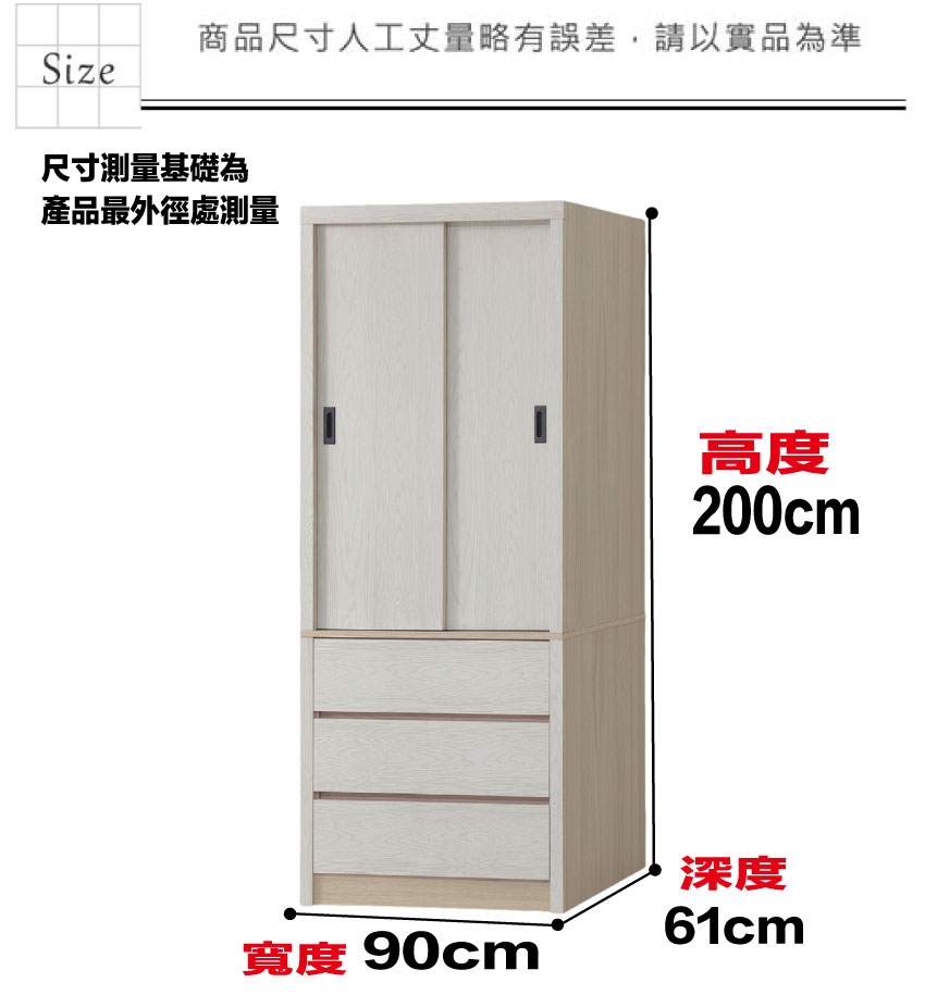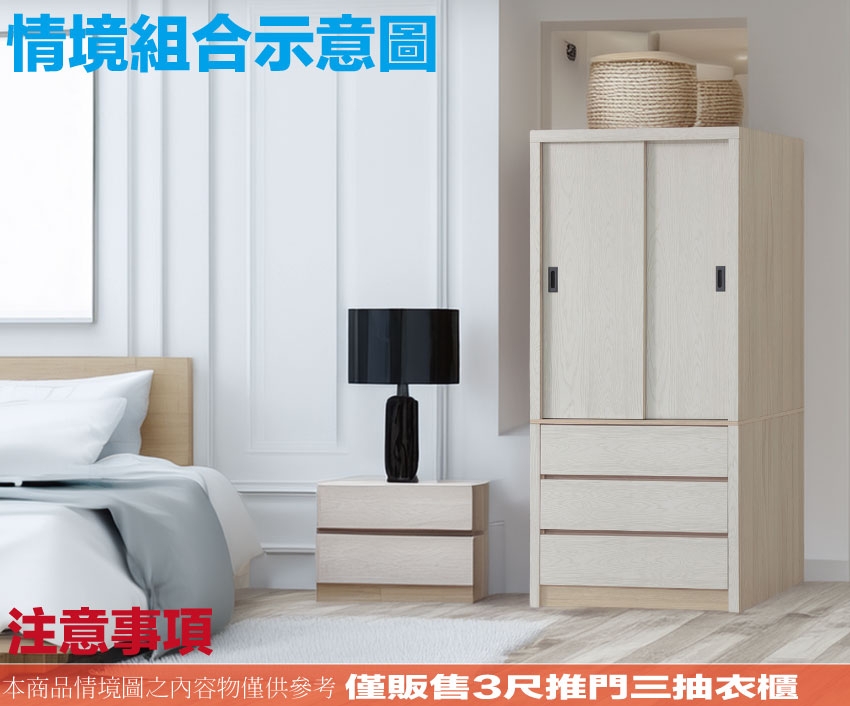 盧克3尺推門三抽衣櫃 尺寸:(寬)90x(深)61x(高)200/公分 ◆材質: 材質:防蛀木心板+防潮耐磨底座(可調高低水平)+面板採用耐磨紋美耐皿材質 - ◎注意事項:
