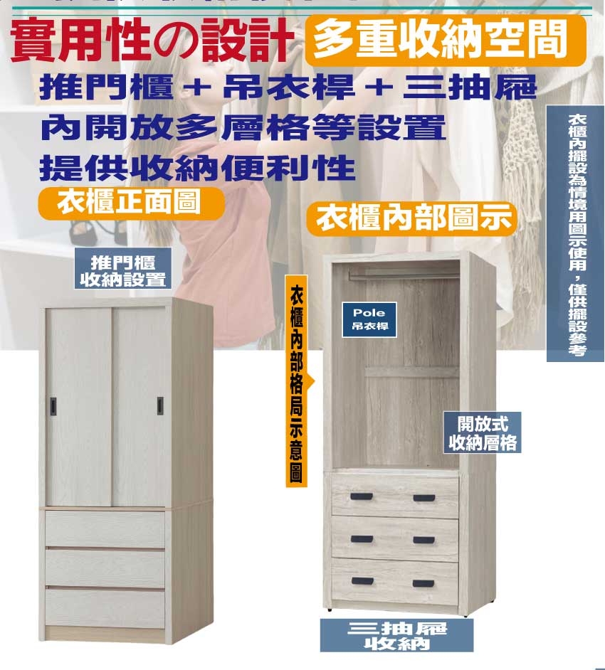- 推門櫃+吊衣桿+三抽屜