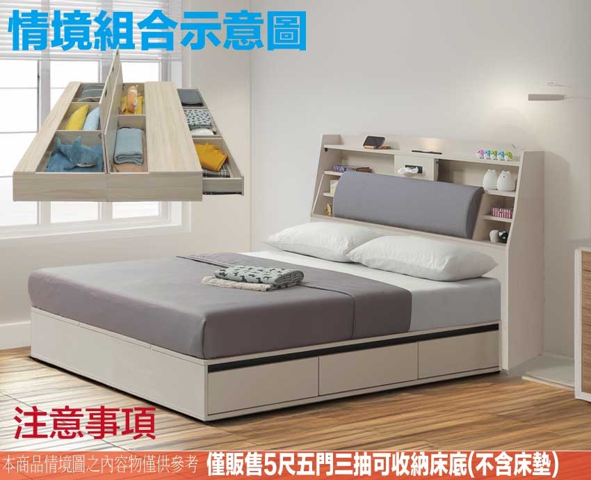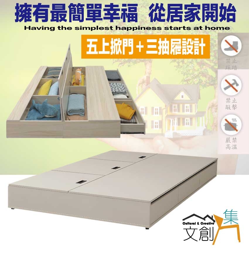 床底座設置有可上掀開門櫃+側邊三抽屜等收納機能性設計