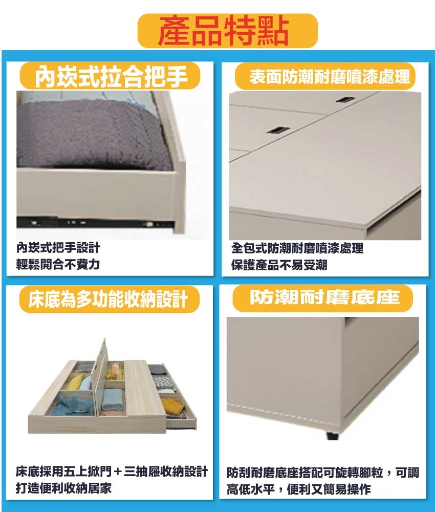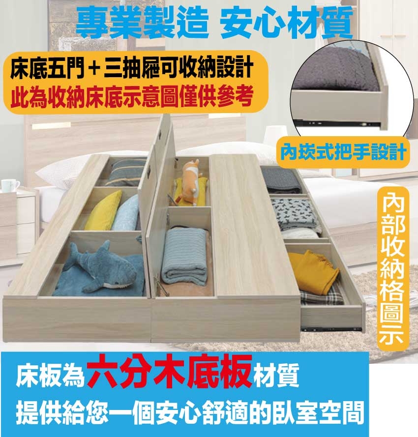採用防蛀木心板+六分木床底板+防潮耐磨底座+防夾手緩衝五金等安心材質製造
