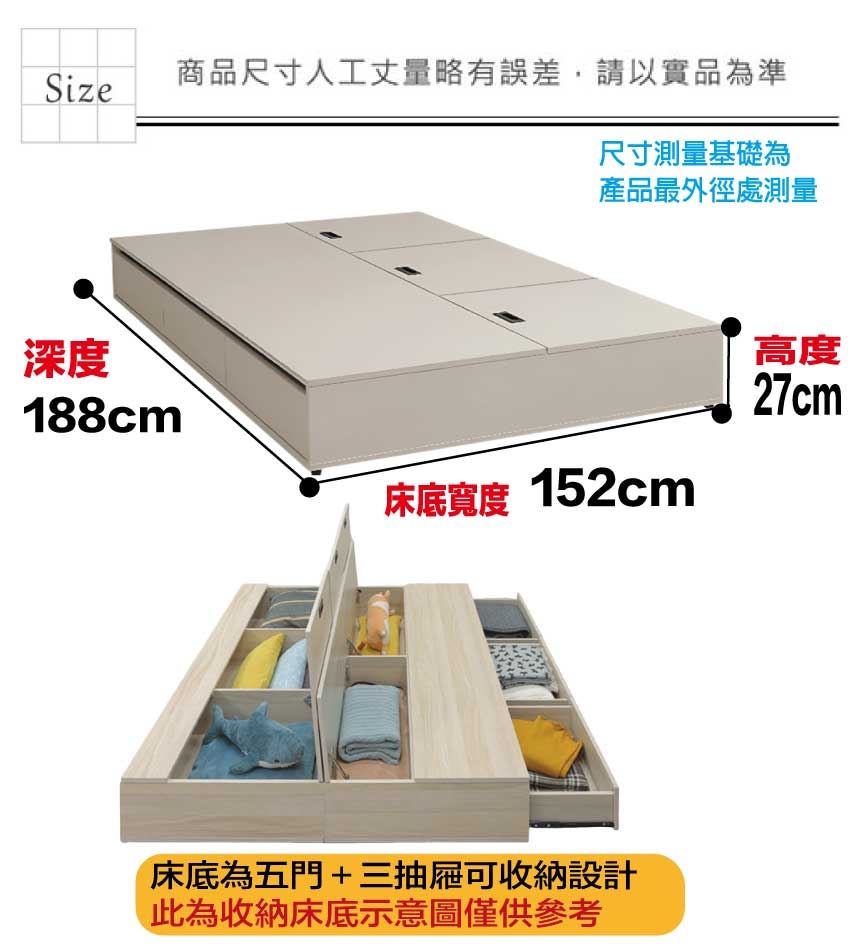 羅特5尺雙人收納五門三抽床底座(不含床墊) 床底尺寸:(寬)152x(深)188x(高)27/公分 ◆材質: 材質:防蛀木心板+六分木床底板+防潮耐磨底座(可旋轉調整腳粒)+床底門片為防夾手緩衝門片五金 - ◎注意事項:
