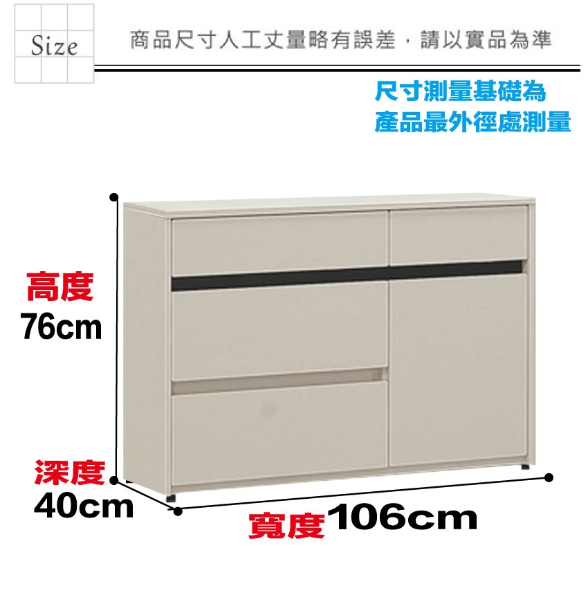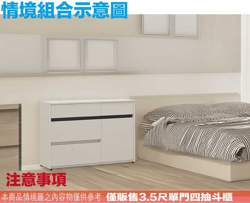 羅特3.5尺四抽單門斗櫃 尺寸:(寬)106x(深)40x(高)76/公分 ◆材質: 材質:防蛀木心板+防潮耐磨底座(可旋轉調整腳粒) - ◎注意事項: