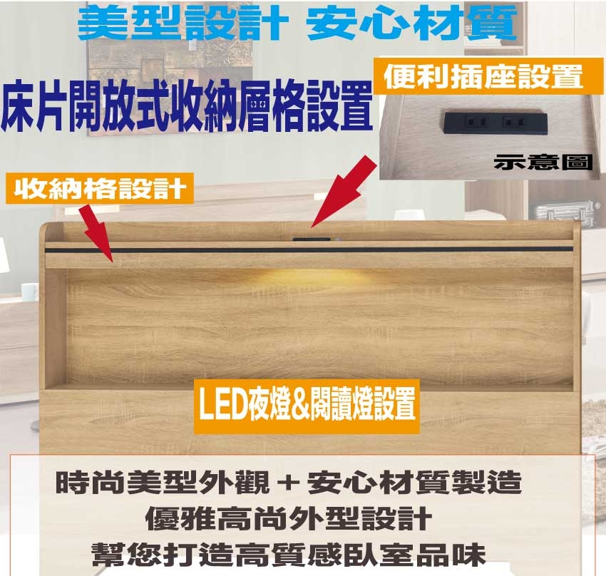 搭配採用開放收納層格+LED夜燈&二孔插座設置等收納空間設計