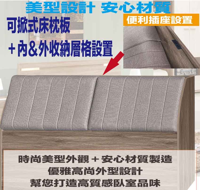 搭配採用床頭箱可掀式床枕板+內&外收納層格+便利插座設置等收納空間設計