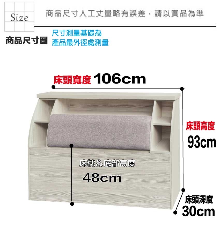 床頭尺寸:(寬)106x(深)30x(高)93/公分