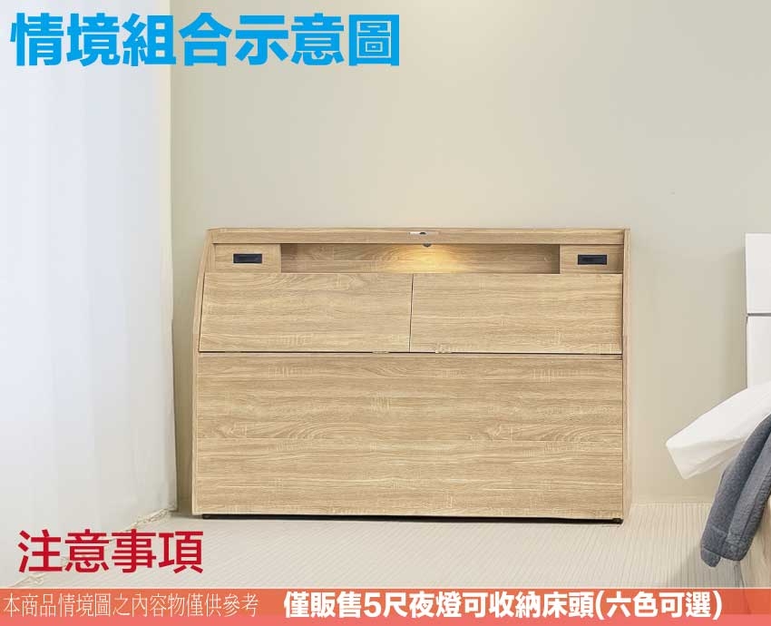 搭配採用床頭箱可掀式床枕板+內&外收納層格+LED夜燈&便利插座設置等收納空間設計