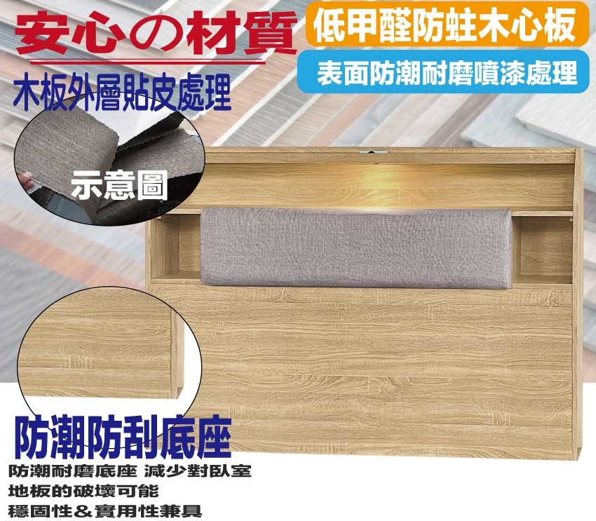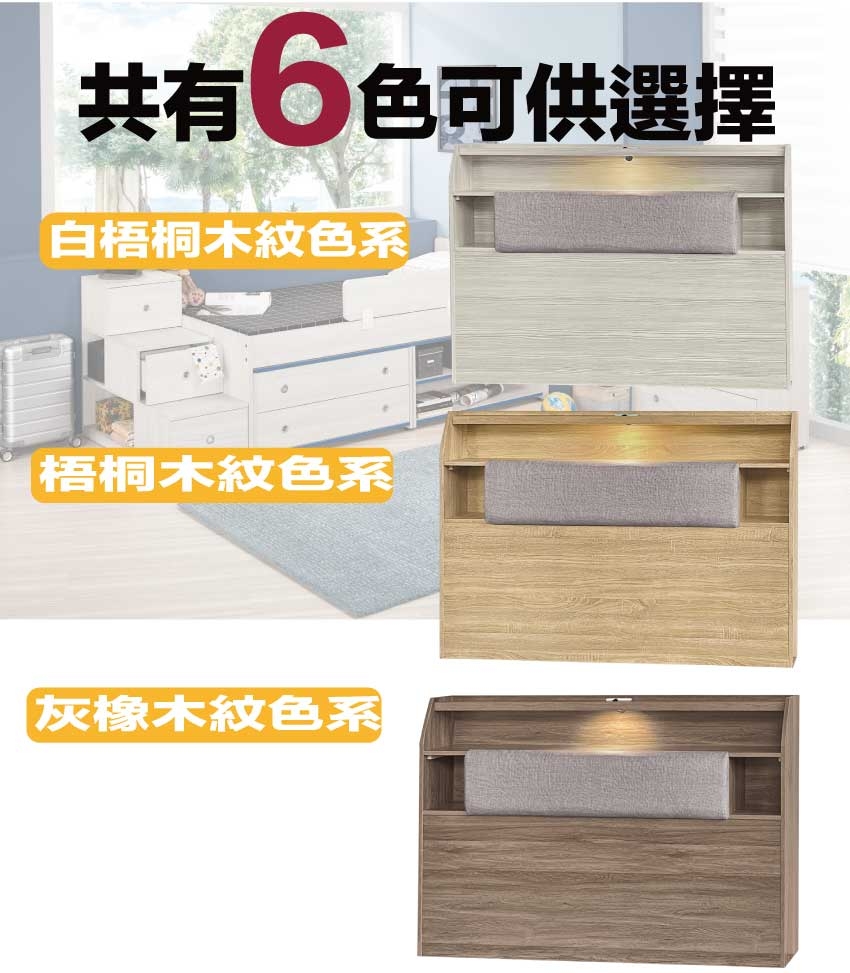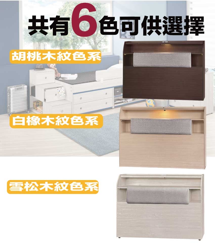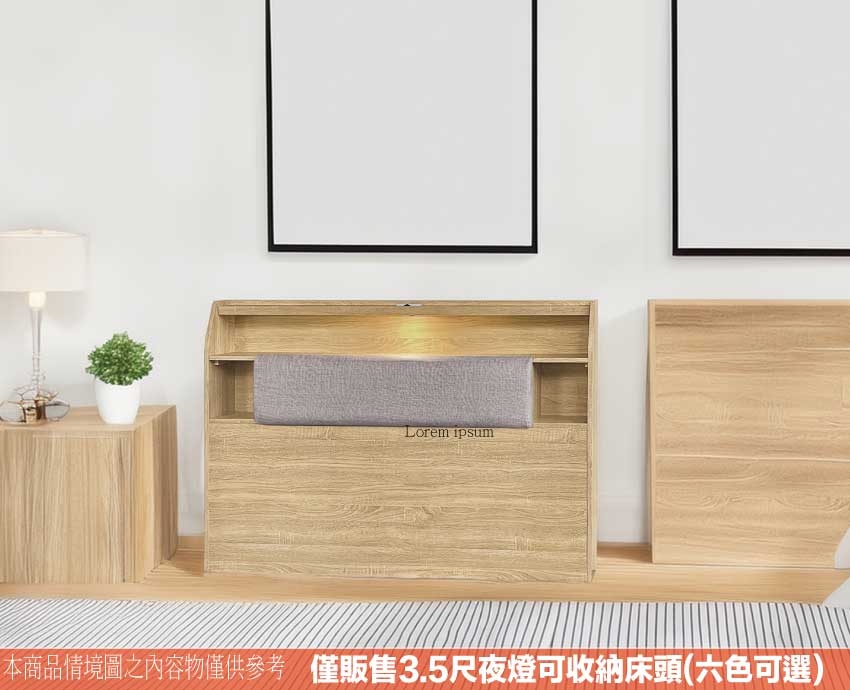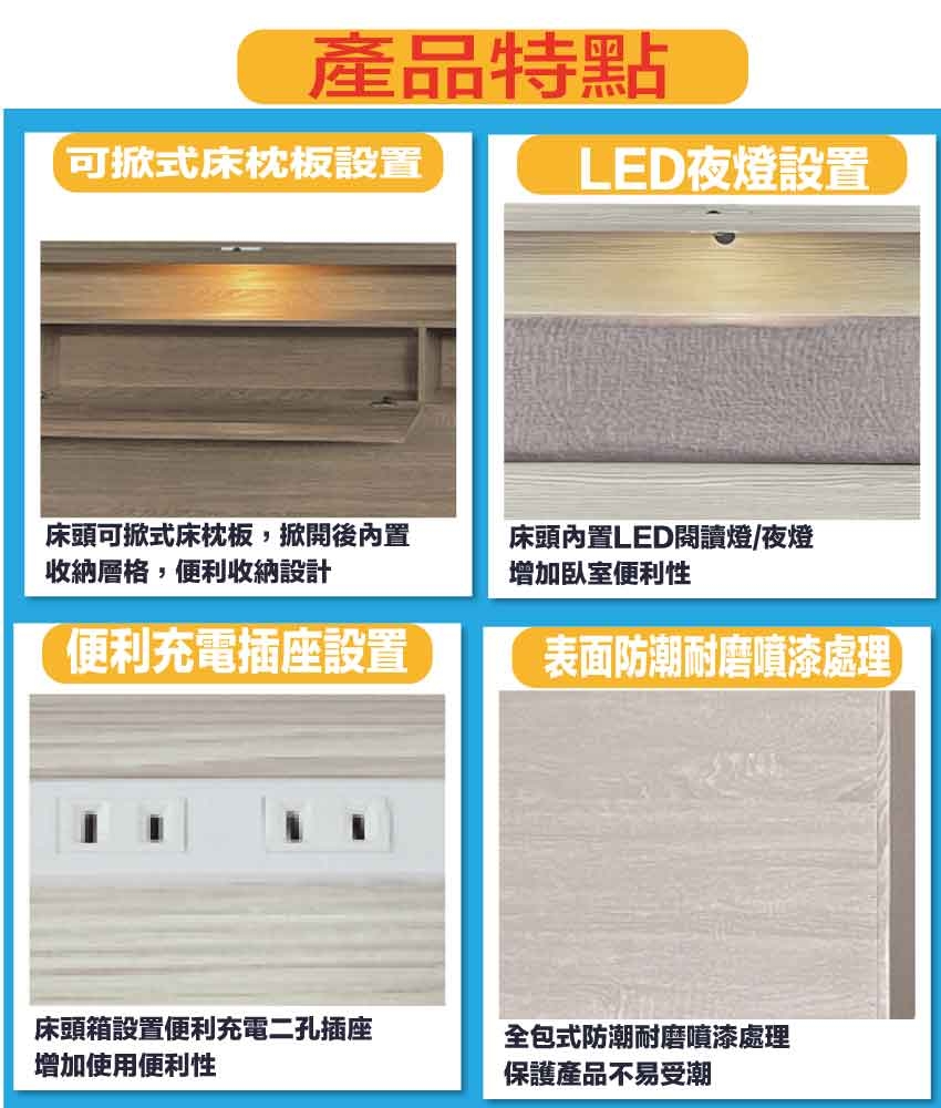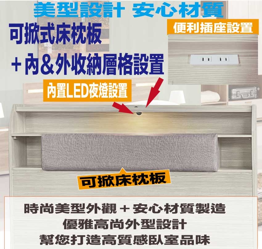 搭配採用床頭箱可掀式床枕板+內&外收納層格+LED夜燈&便利插座設置等收納空間設計