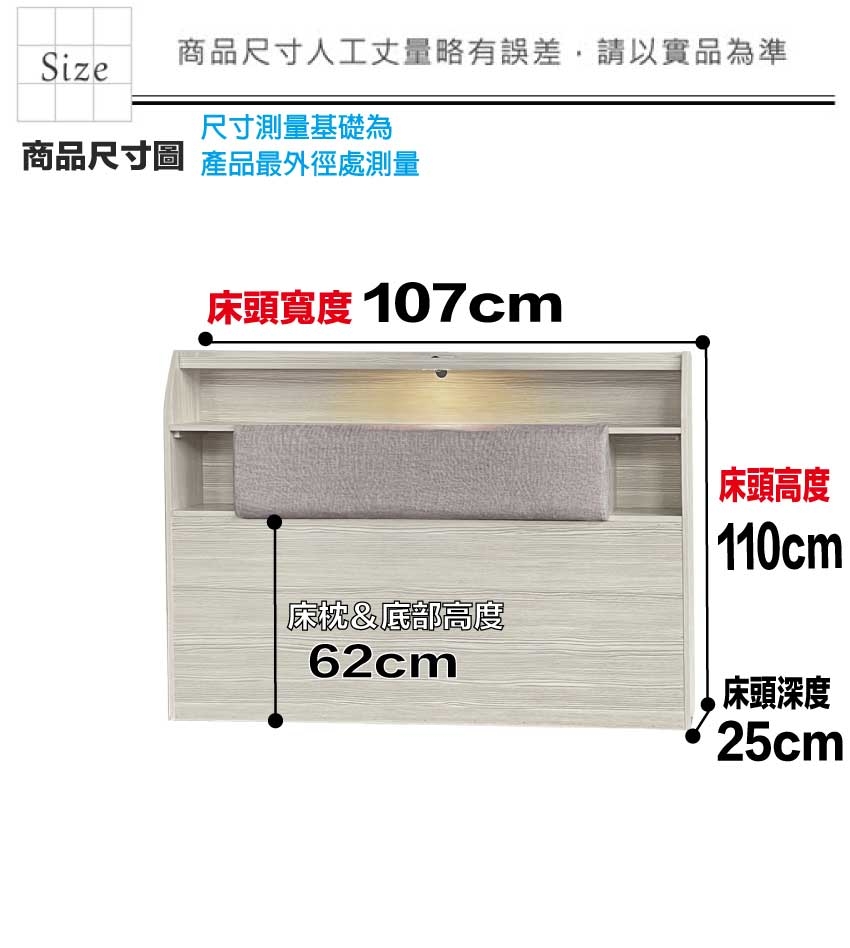 滿意3.5尺單人貓抓皮夜燈加高型床頭箱(六色可選) 床頭尺寸:(寬)107x(深)25x(高)110/公分 ◆材質: 材質:防蛀木心板+防潮耐磨底座+耐磨貓抓皮革+高回彈泡棉 - ◎注意事項:
