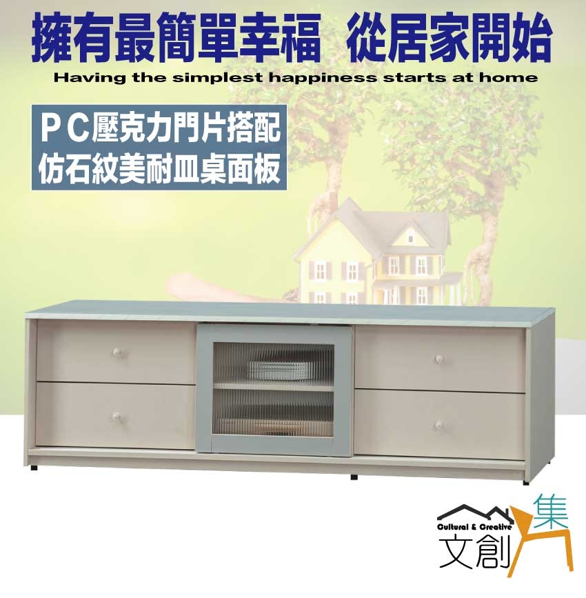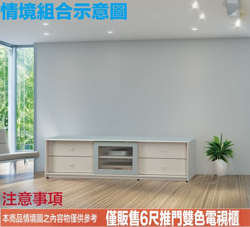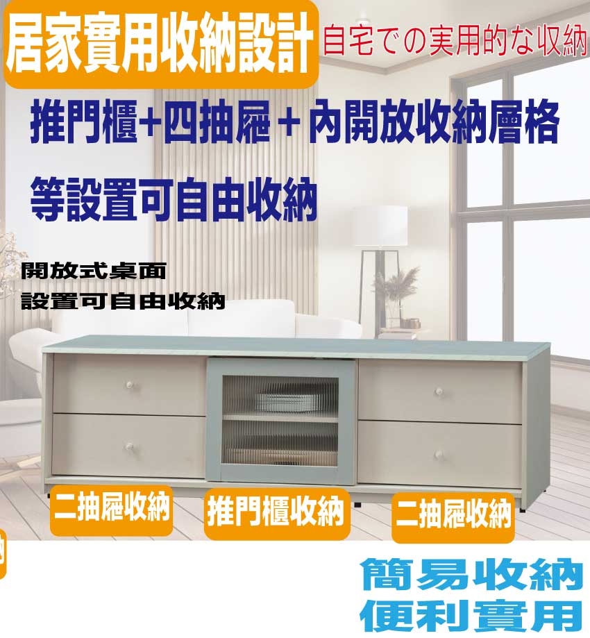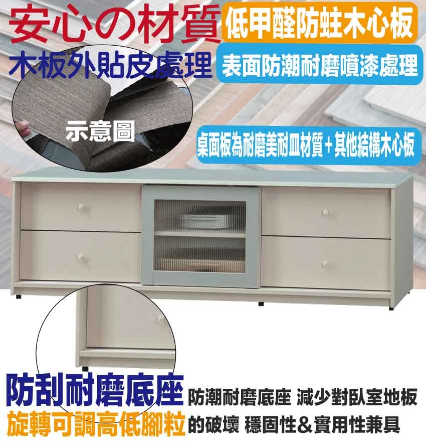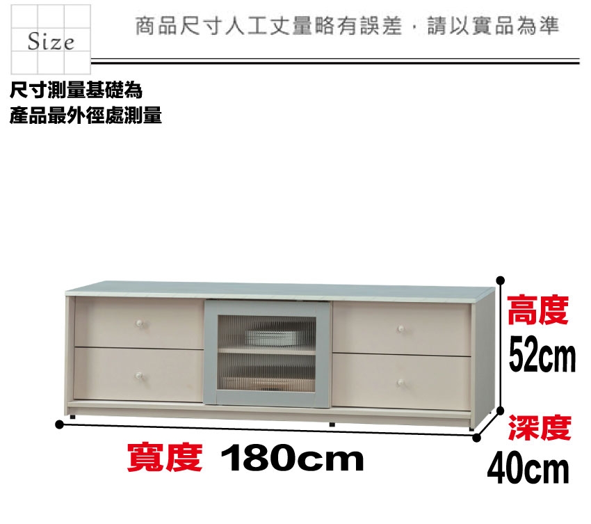 卡黛6尺推門四抽電視櫃 尺寸:(寬)180x(深)40x(高)52/公分 ◆材質: 材質:防蛀木心板+防潮耐磨底座(可調高低水平)+面板採用皮革紋路特殊耐磨處理+PC壓克力門片+仿石紋耐磨美耐皿材質桌面板 - ◎注意事項: