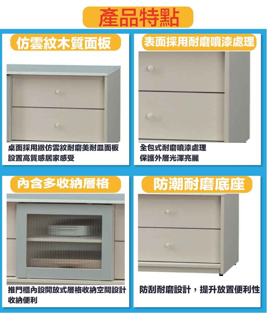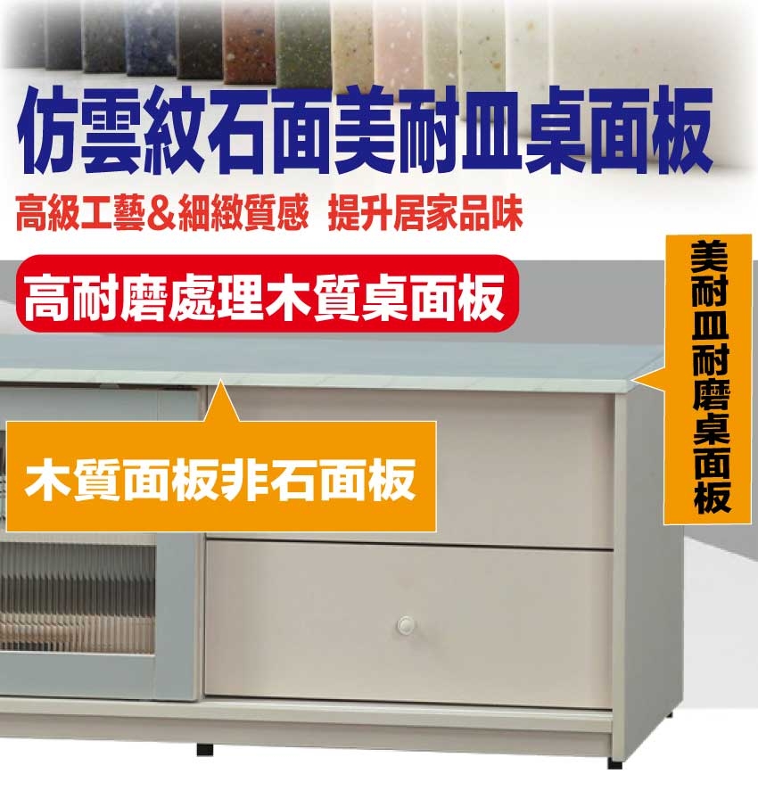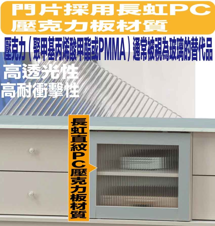 防蛀木心板+防潮耐磨底座(可調高低水平)+PC壓克力門片+仿石紋耐磨美耐皿材質桌面板+面板採用皮革紋路特殊耐磨處理等安心材質製造