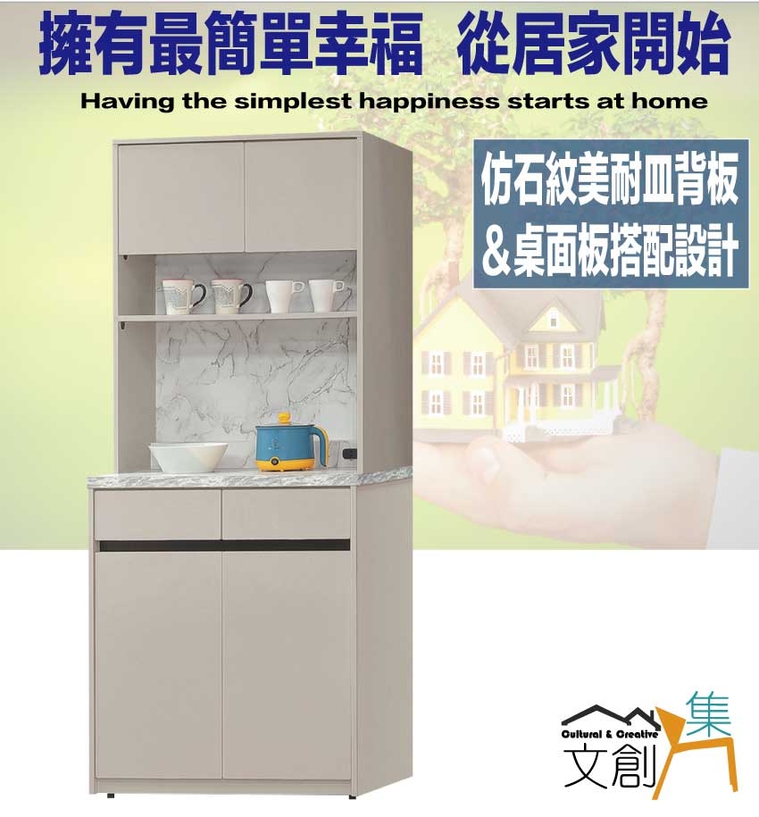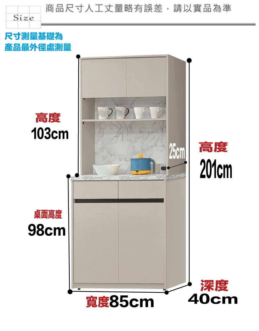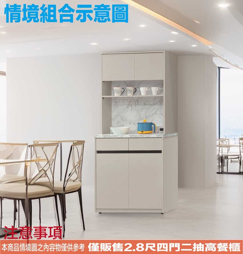 羅特2.8尺四門二抽仿石紋高餐櫃組合 尺寸:(寬)85x(深)40x(高)201/公分 ◆材質: 材質:防蛀木心板+防潮耐磨底座(可旋轉調整腳粒)+防夾手緩衝門片五金+面板&背板採用耐磨紋美耐皿材質 - ◎注意事項:
