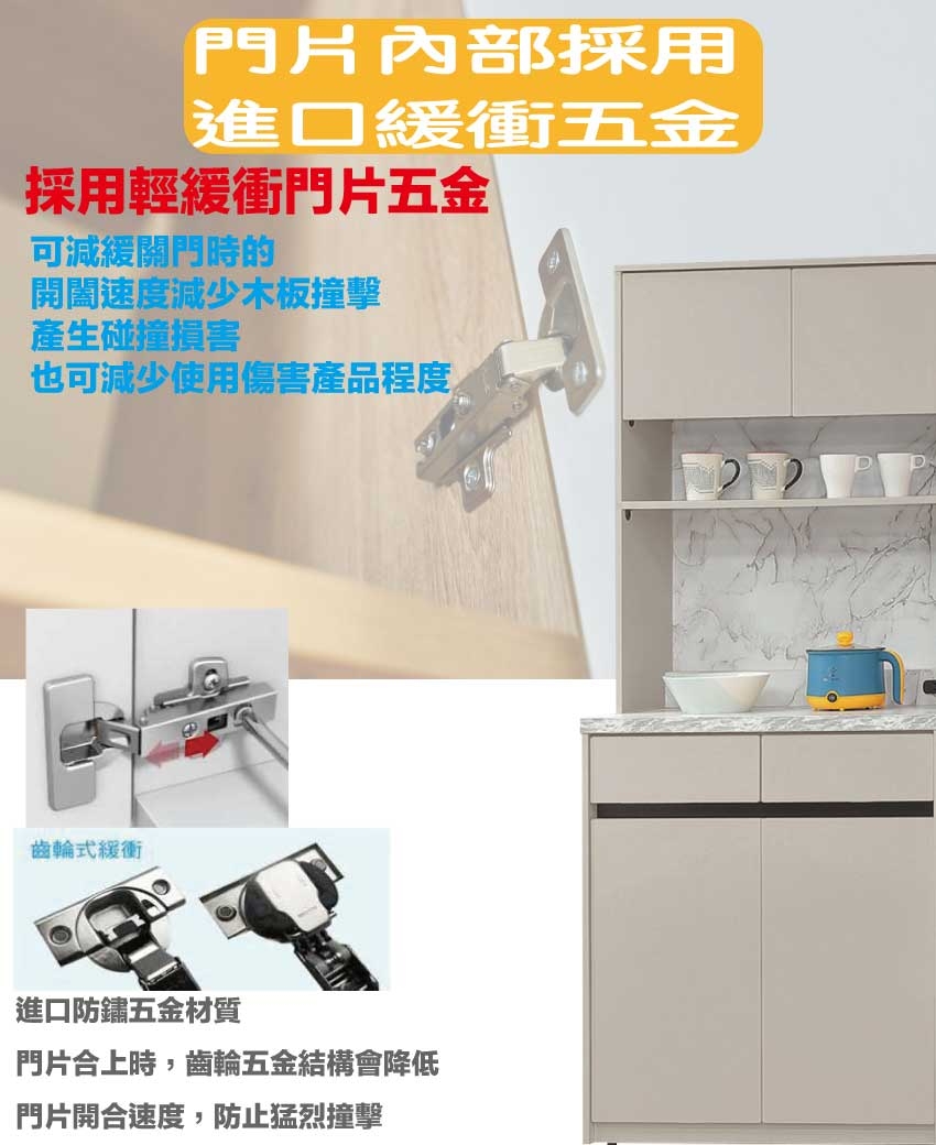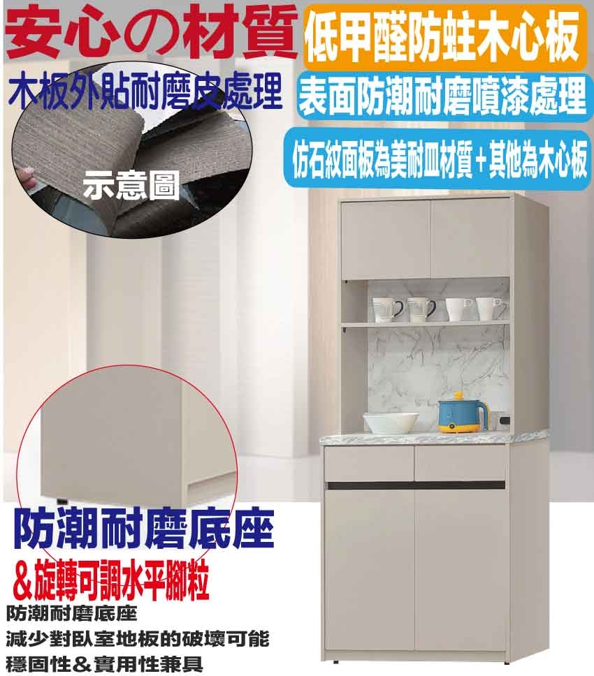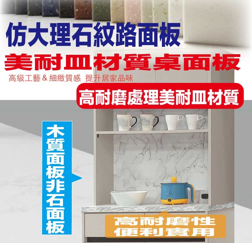 採用防蛀木心板+防潮耐磨底座+防夾手緩衝門片五金+面板&背板採用耐磨仿石紋美耐皿材質等安心材質製造