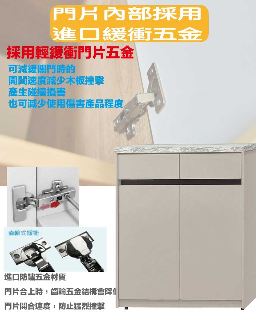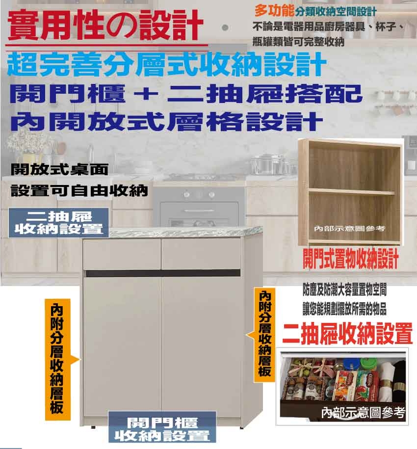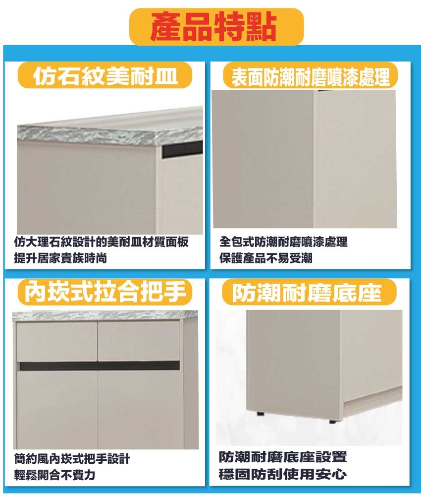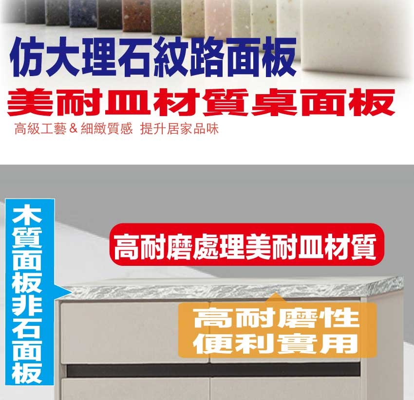 採用防蛀木心板+防潮耐磨底座+防夾手緩衝門片五金+面板採用耐磨仿石紋美耐皿材質等安心材質製造