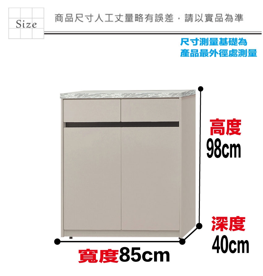材質:防蛀木心板+防潮耐磨底座(可旋轉調整腳粒)+防夾手緩衝門片五金+面板採用耐磨紋美耐皿材質