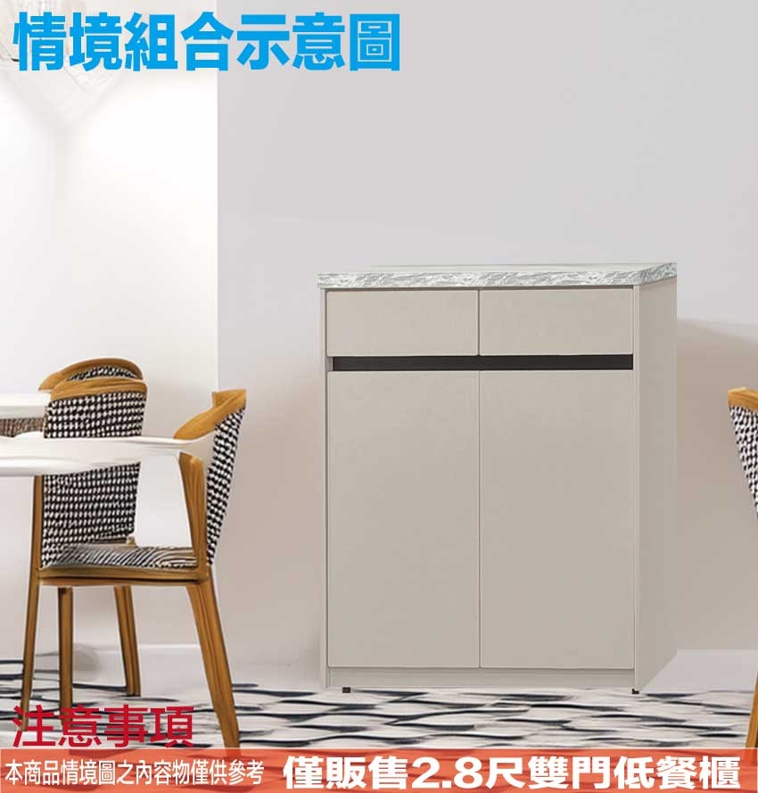 【綠家居】羅特2.8尺二門二抽仿石紋低餐櫃    淺奶茶木紋色系+現代簡約風格+安心材質製造,整體採用防蛀木心板+防潮耐磨底座+防夾手緩衝門片五金+面板採用耐磨仿石紋美耐皿材質等安心材質製造,產品外層採用防潮耐磨噴漆處理搭配開門櫃+二抽屜+內開放層格&桌面等收納空間設計,全由專人配送到家,專業安心服務,替你省下更多時間!