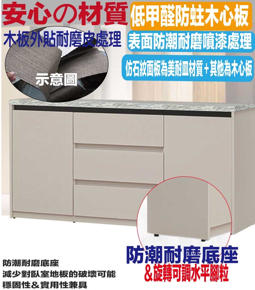 材質:防蛀木心板+防潮耐磨底座(可旋轉調整腳粒)+防夾手緩衝門片五金+面板採用耐磨紋美耐皿材質