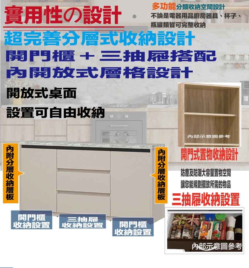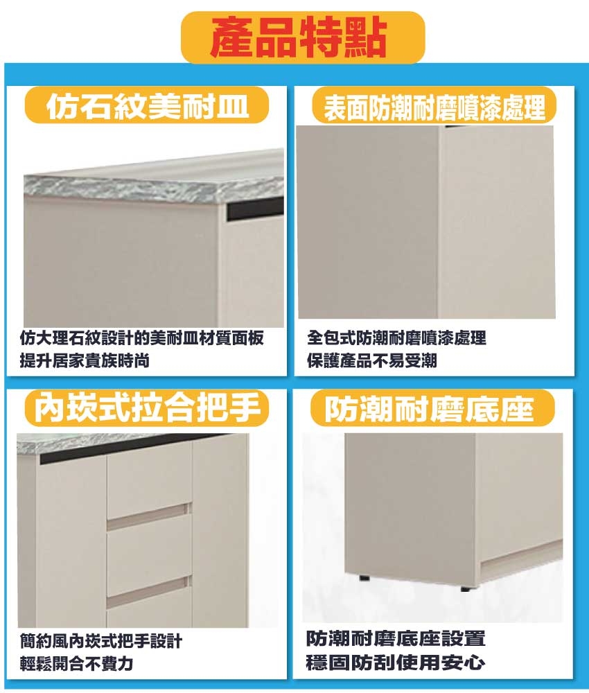 採用防蛀木心板+防潮耐磨底座+防夾手緩衝門片五金+面板採用耐磨仿石紋美耐皿材質等安心材質製造