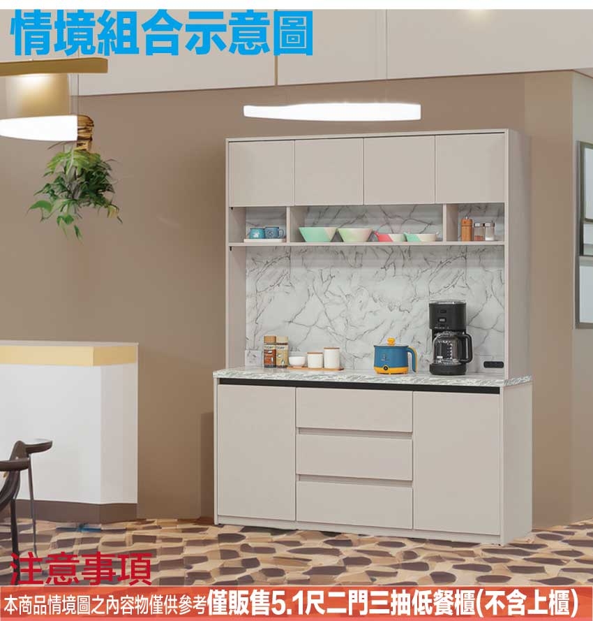 【綠家居】羅特5.1尺二門三抽仿石紋低餐櫃     淺奶茶木紋色系+現代簡約風格+安心材質製造,整體採用防蛀木心板+防潮耐磨底座+防夾手緩衝門片五金+面板採用耐磨仿石紋美耐皿材質等安心材質製造,產品外層採用防潮耐磨噴漆處理搭配開門櫃+三抽屜+內開放層格等收納空間設計,全由專人配送到家,專業安心服務,替你省下更多時間!